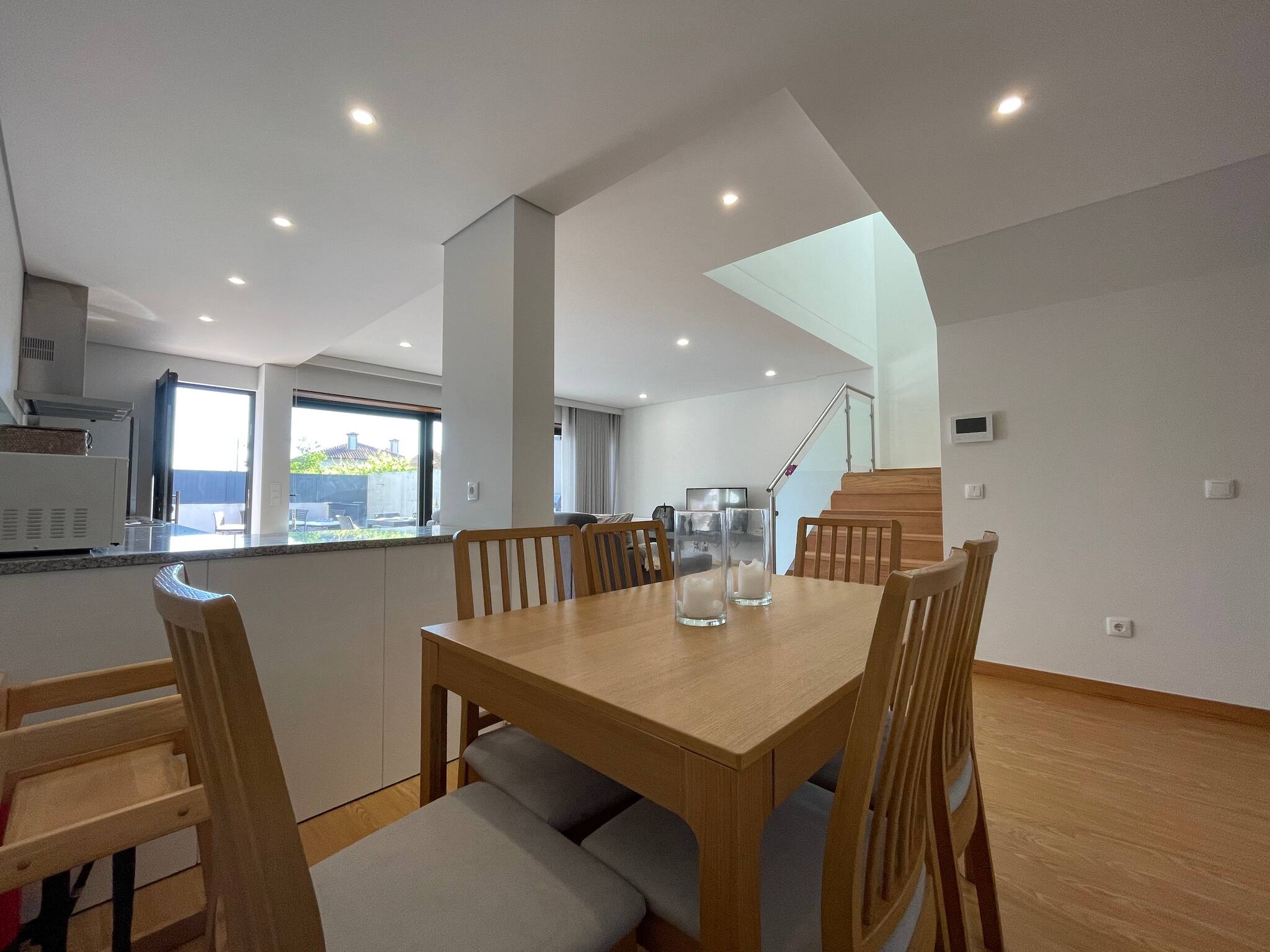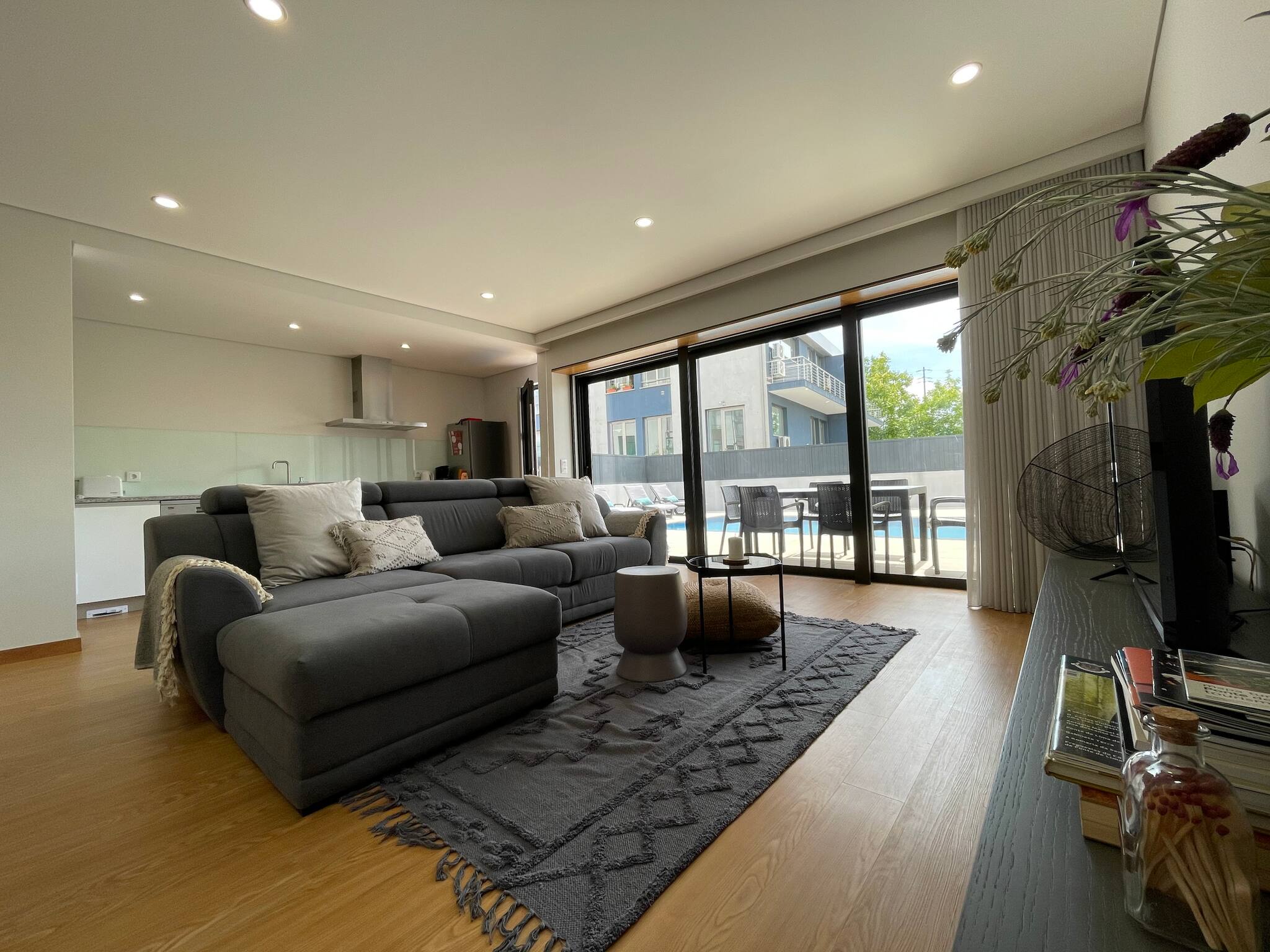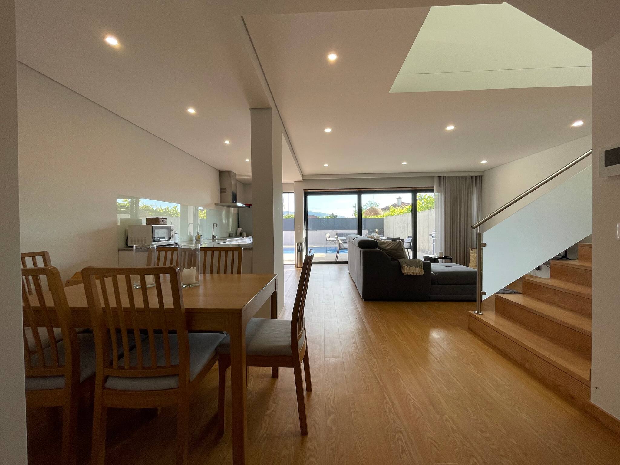 - no rés-do-chão, ao nível da piscina, uma ampla sala de estar, cozinha e sala de jantar. Além de um dos quartos (com cama de casal) e uma casa de banho que serve também de wc de serviço. Tem também a zona de lavandaria.