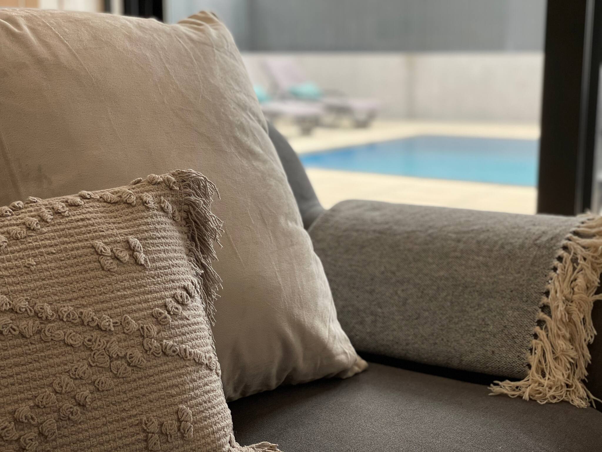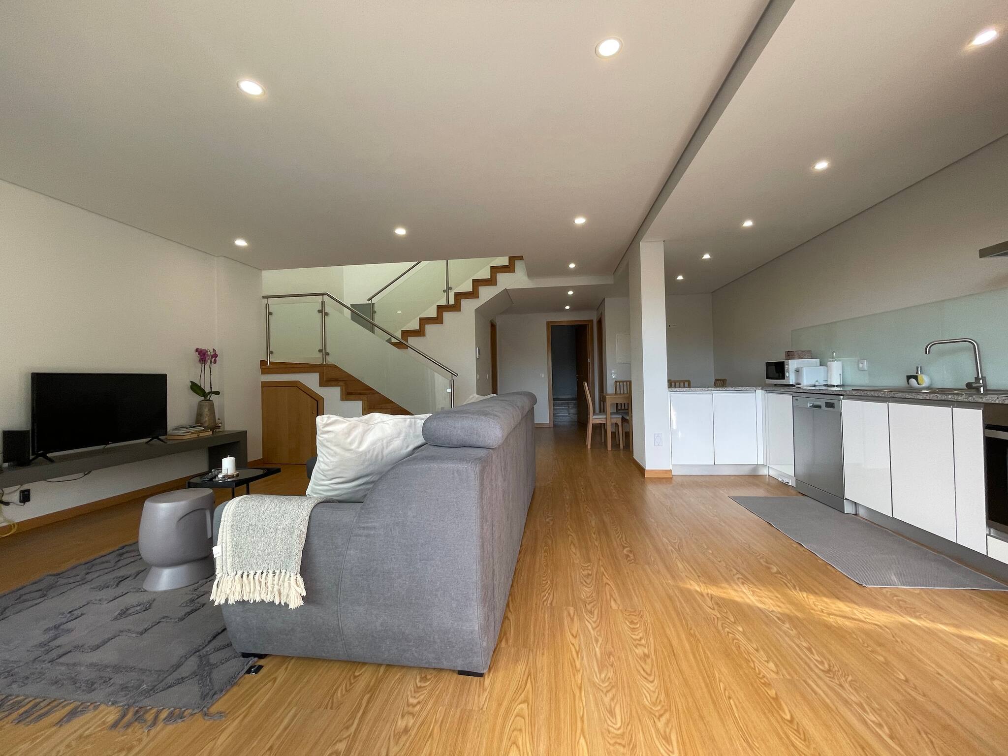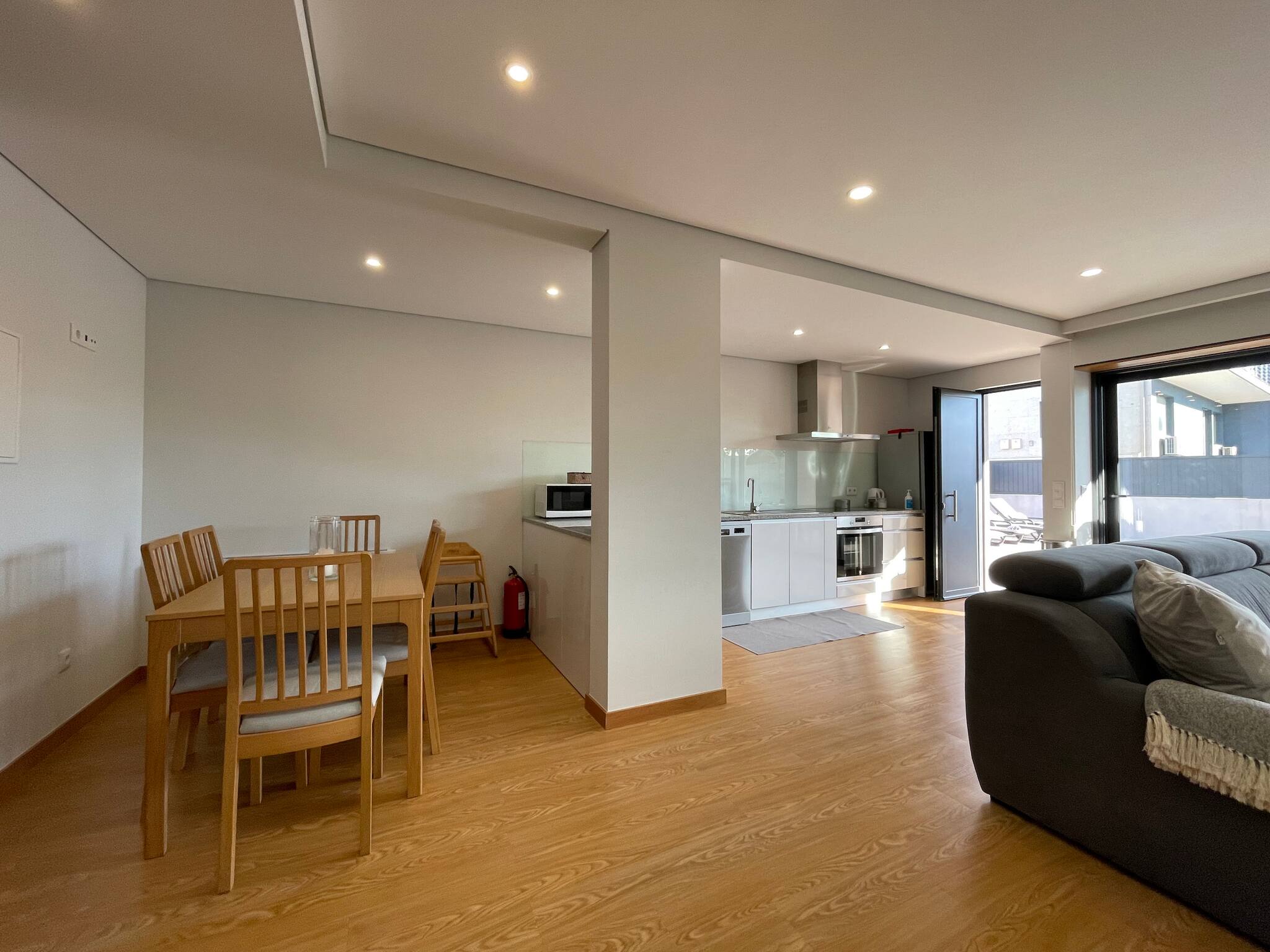- no rés-do-chão, ao nível da piscina, uma ampla sala de estar, cozinha e sala de jantar. Além de um dos quartos (com cama de casal) e uma casa de banho que serve também de wc de serviço. Tem também a zona de lavandaria.