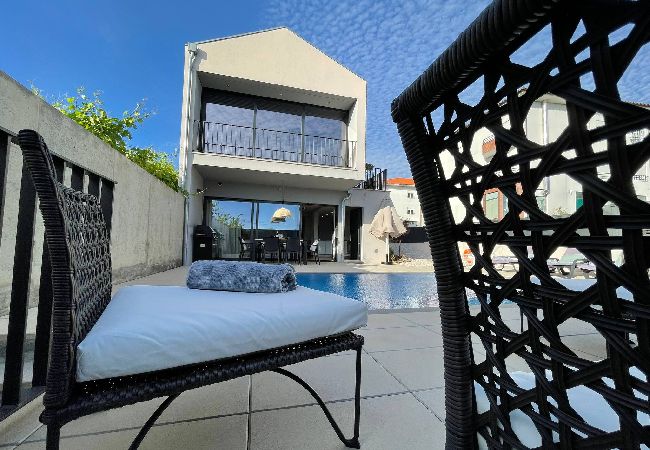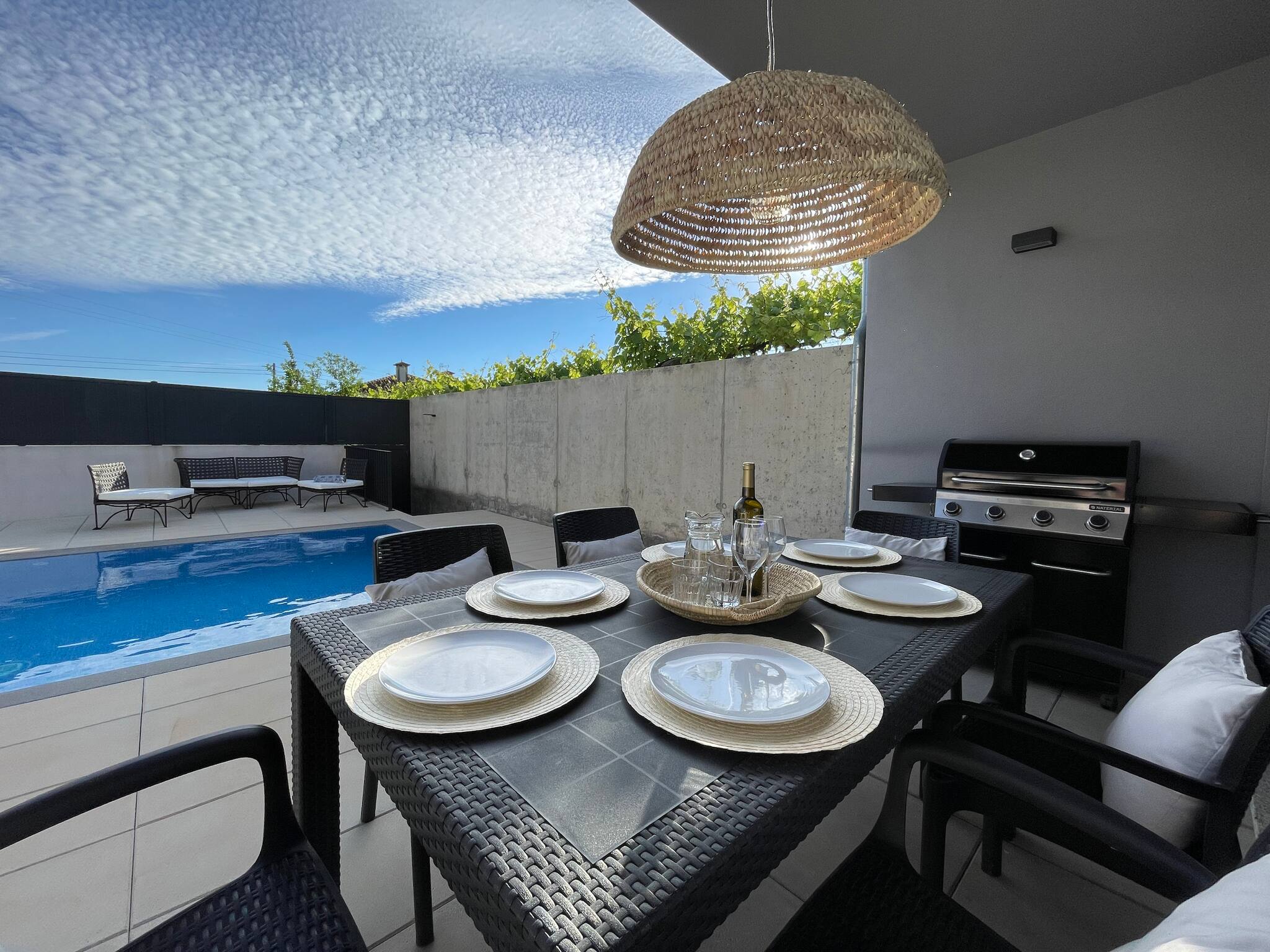 No exterior, a casa conta com um pequeno jardim lateral e a zona da piscina com espreguiçadeiras para banhos de sol, bem como uma mesa de refeições exterior e um fantástico barbecue para as suas refeições de Verão!