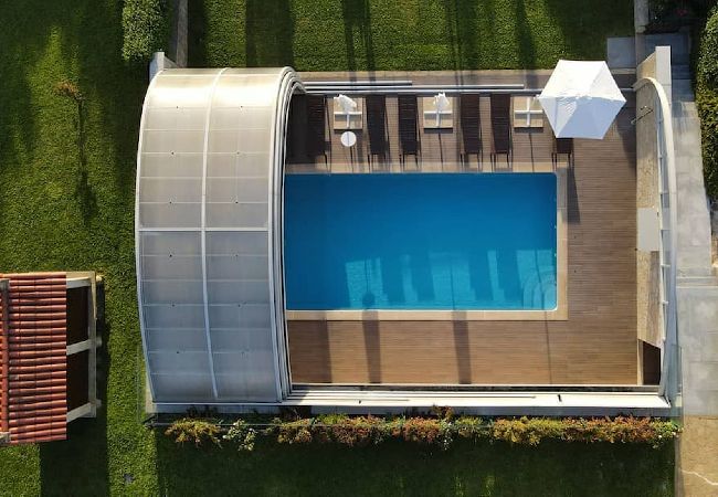 A piscina é privada e tem acesso também pelo interior do alojamento, com cobertura telescópica e possibilidade de ser aquecida, mediante pagamento de taxa extra.