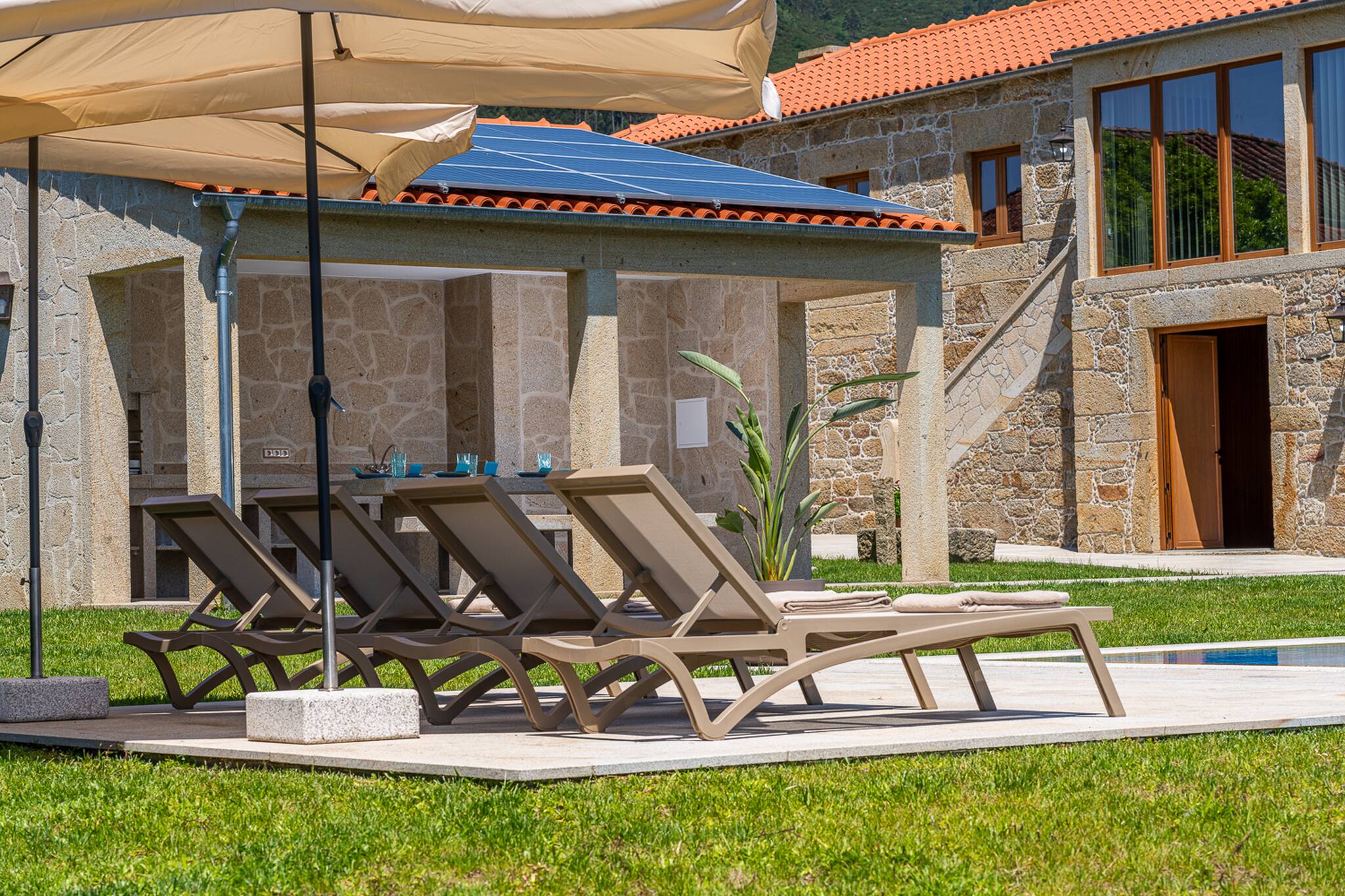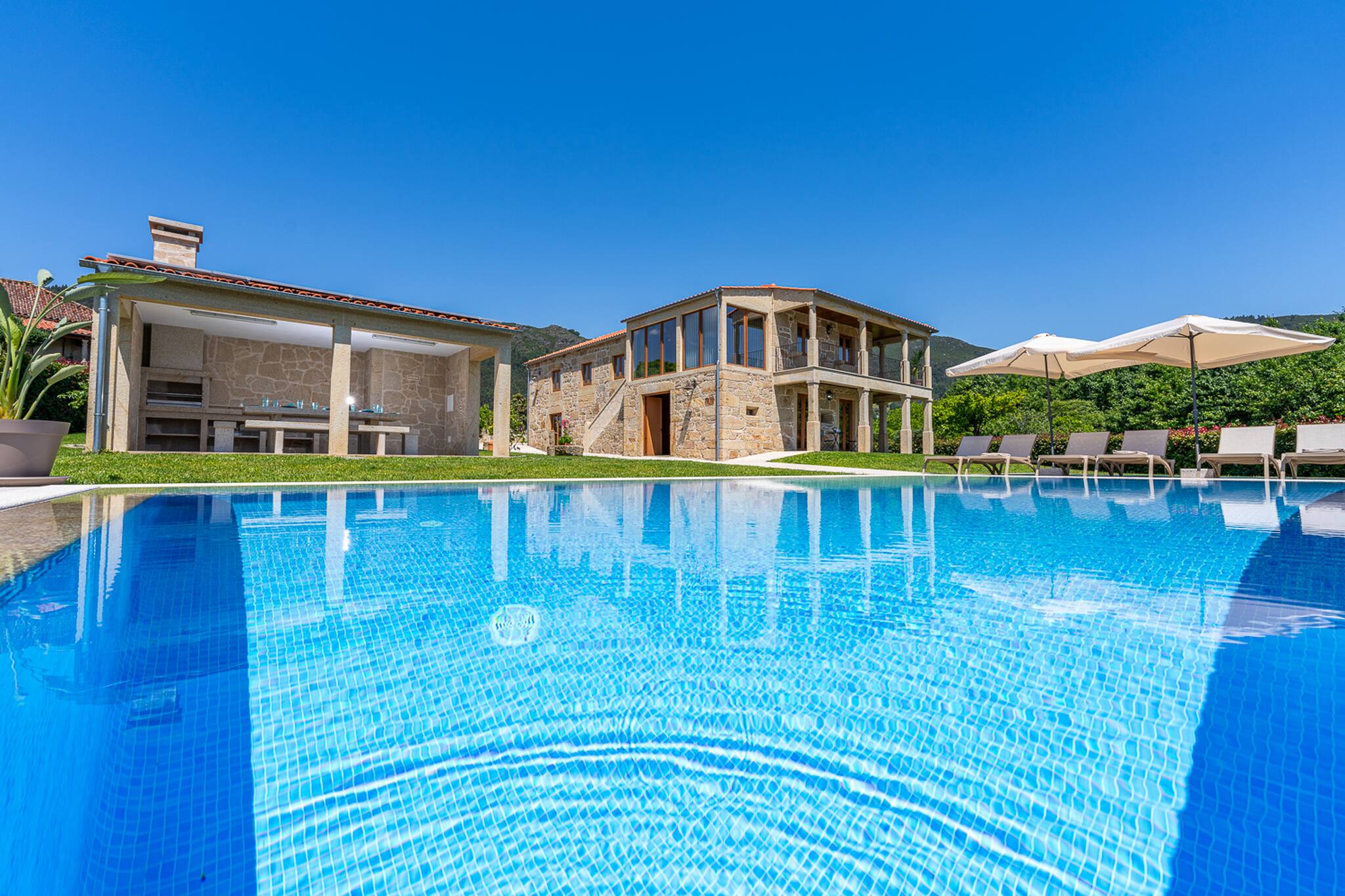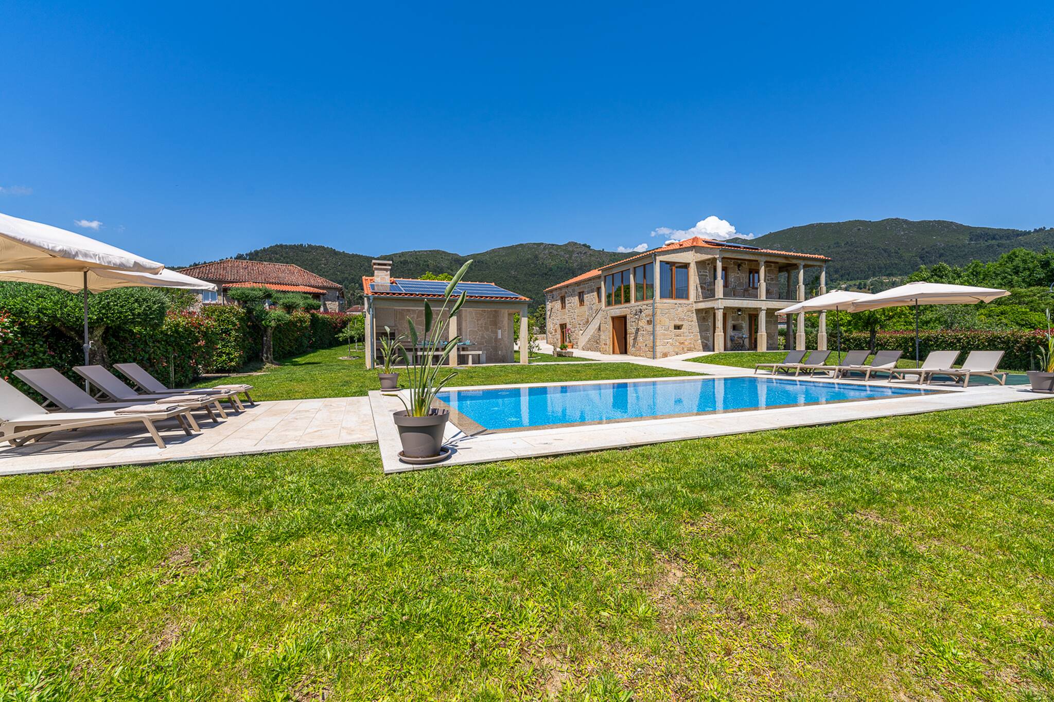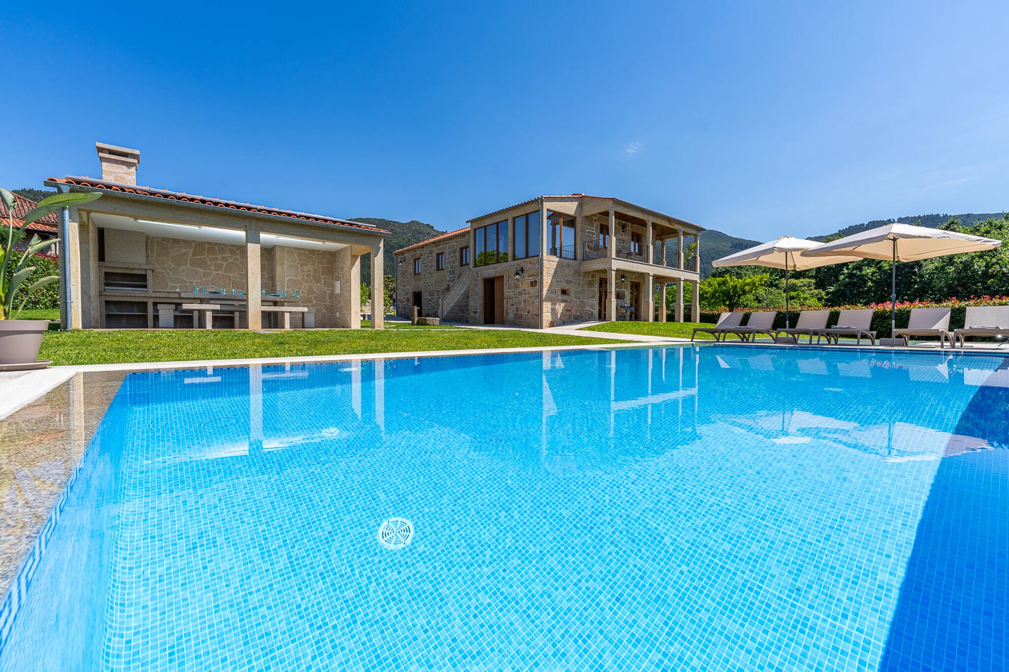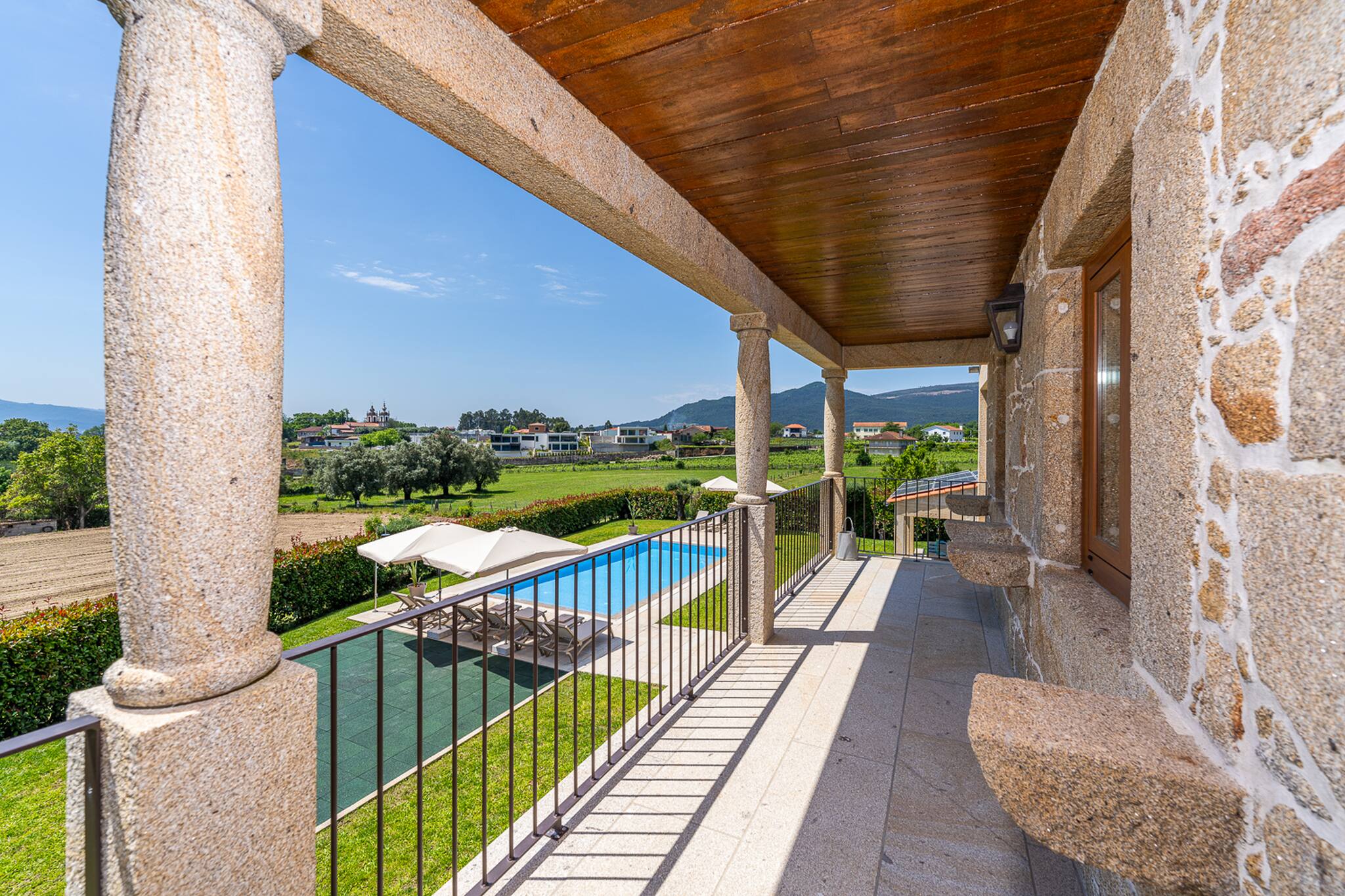 Saia da casa para o terraço coberto que atravessa a fachada principal da casa e ficará envolvido pelo relvado e verá a peça central do jardim bem cuidado: uma atraente piscina cercada de granito e uma tradicional "eira" em granito envelhecido.