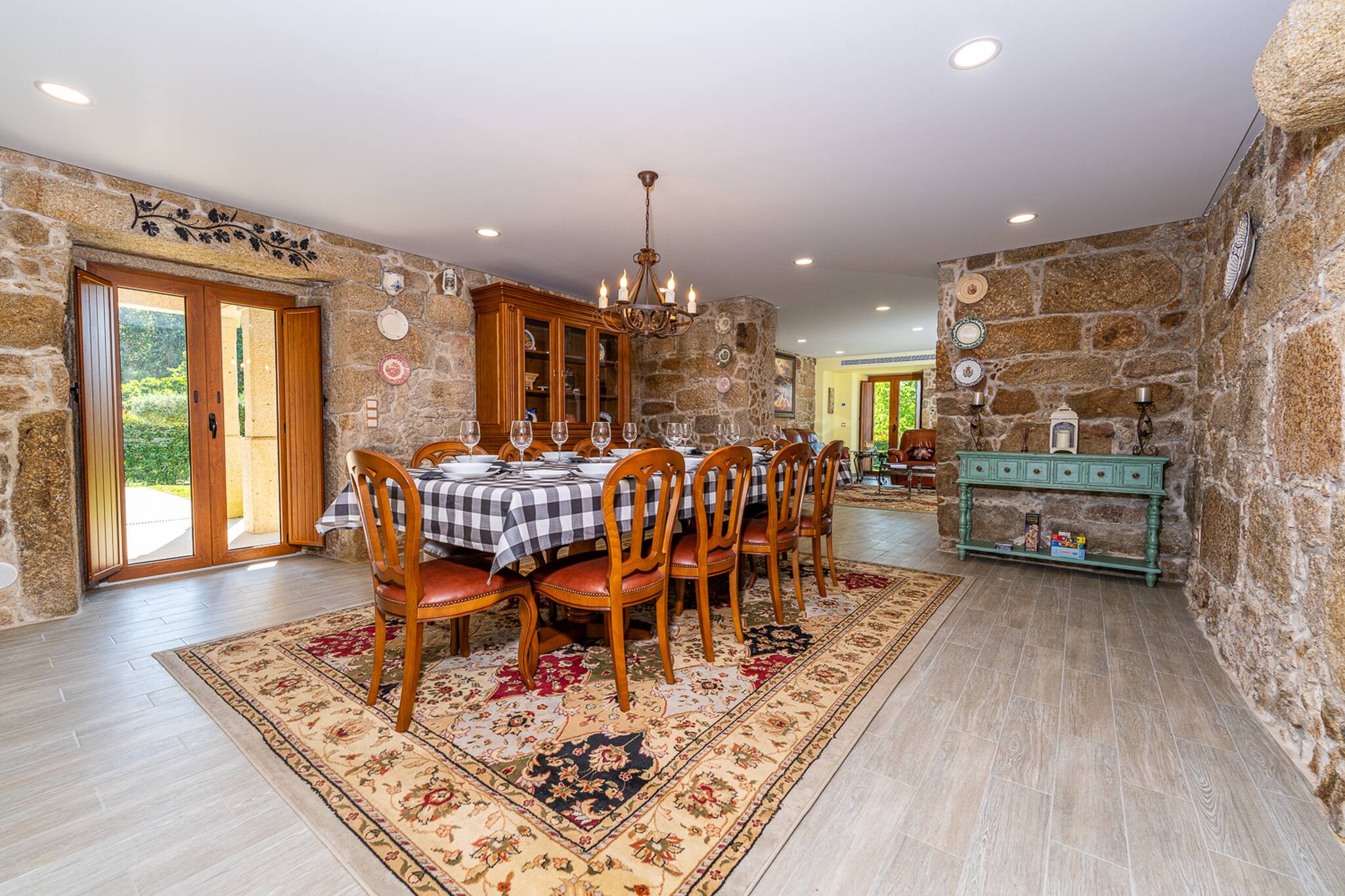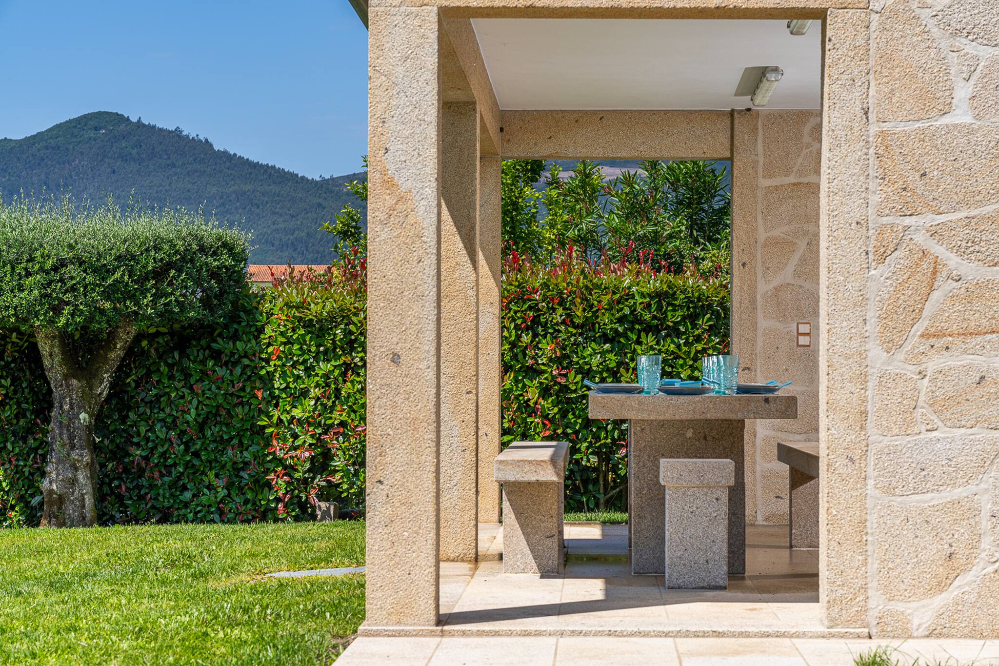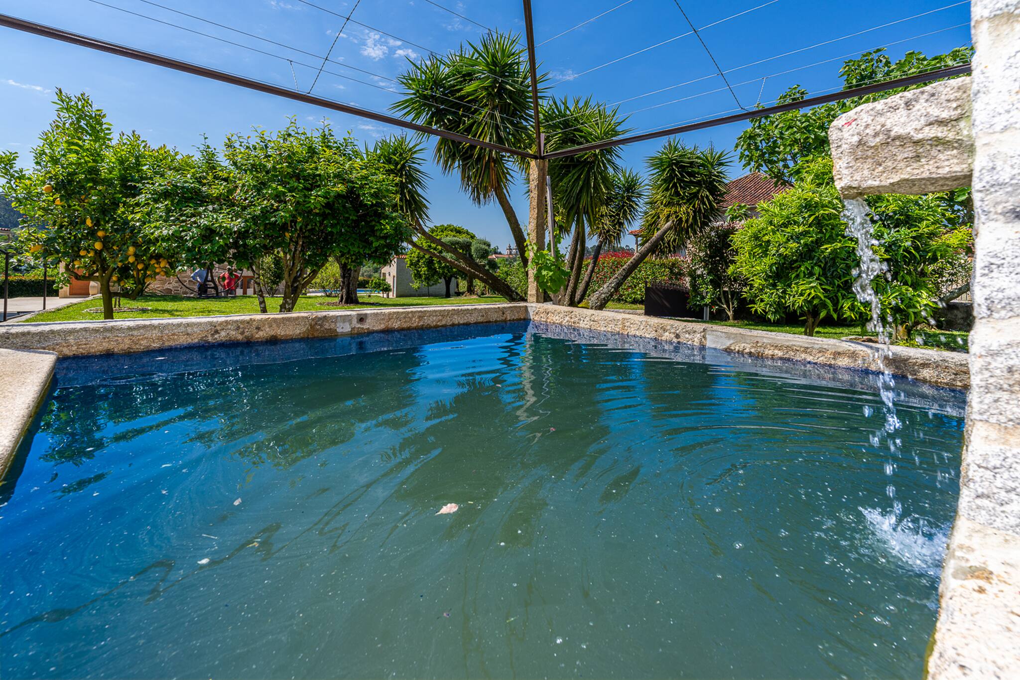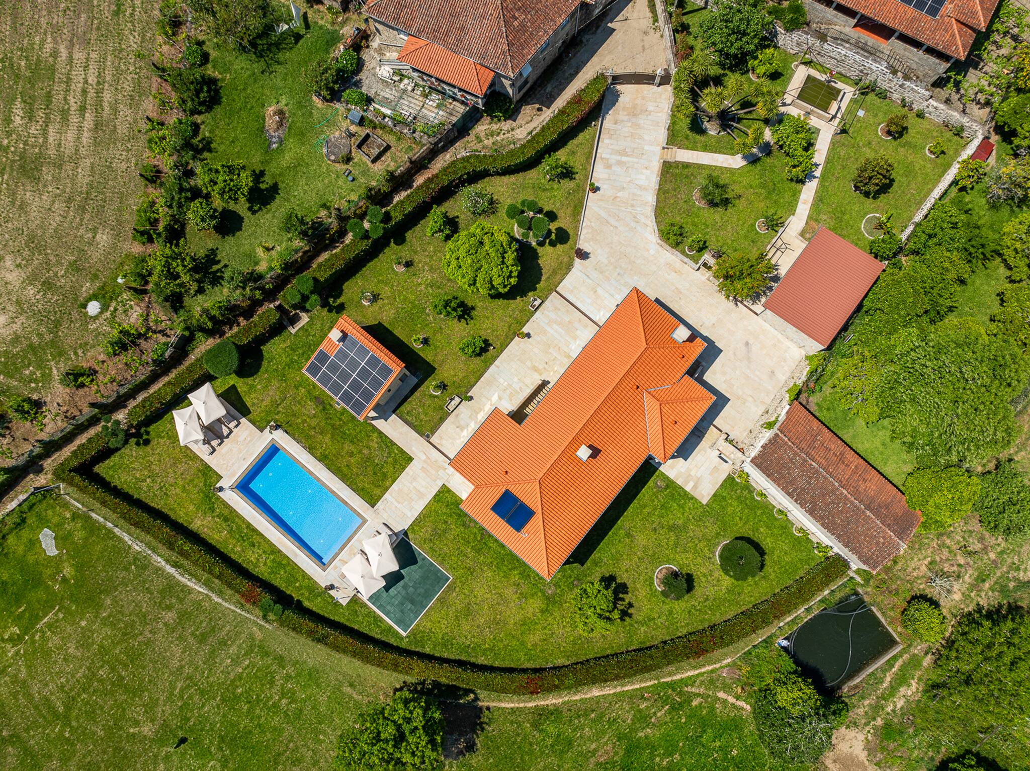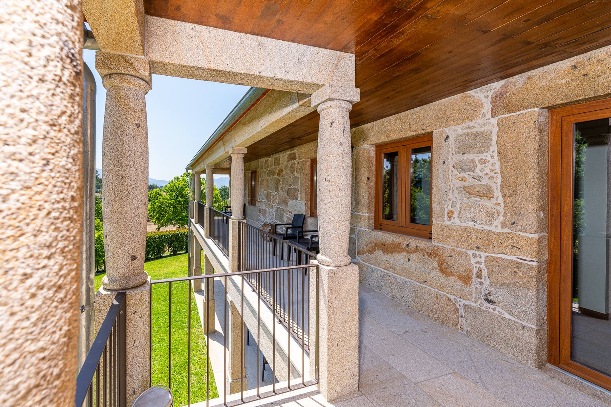 Saia da casa para o terraço coberto que atravessa a fachada principal da casa e ficará envolvido pelo relvado e verá a peça central do jardim bem cuidado: uma atraente piscina cercada de granito e uma tradicional "eira" em granito envelhecido.