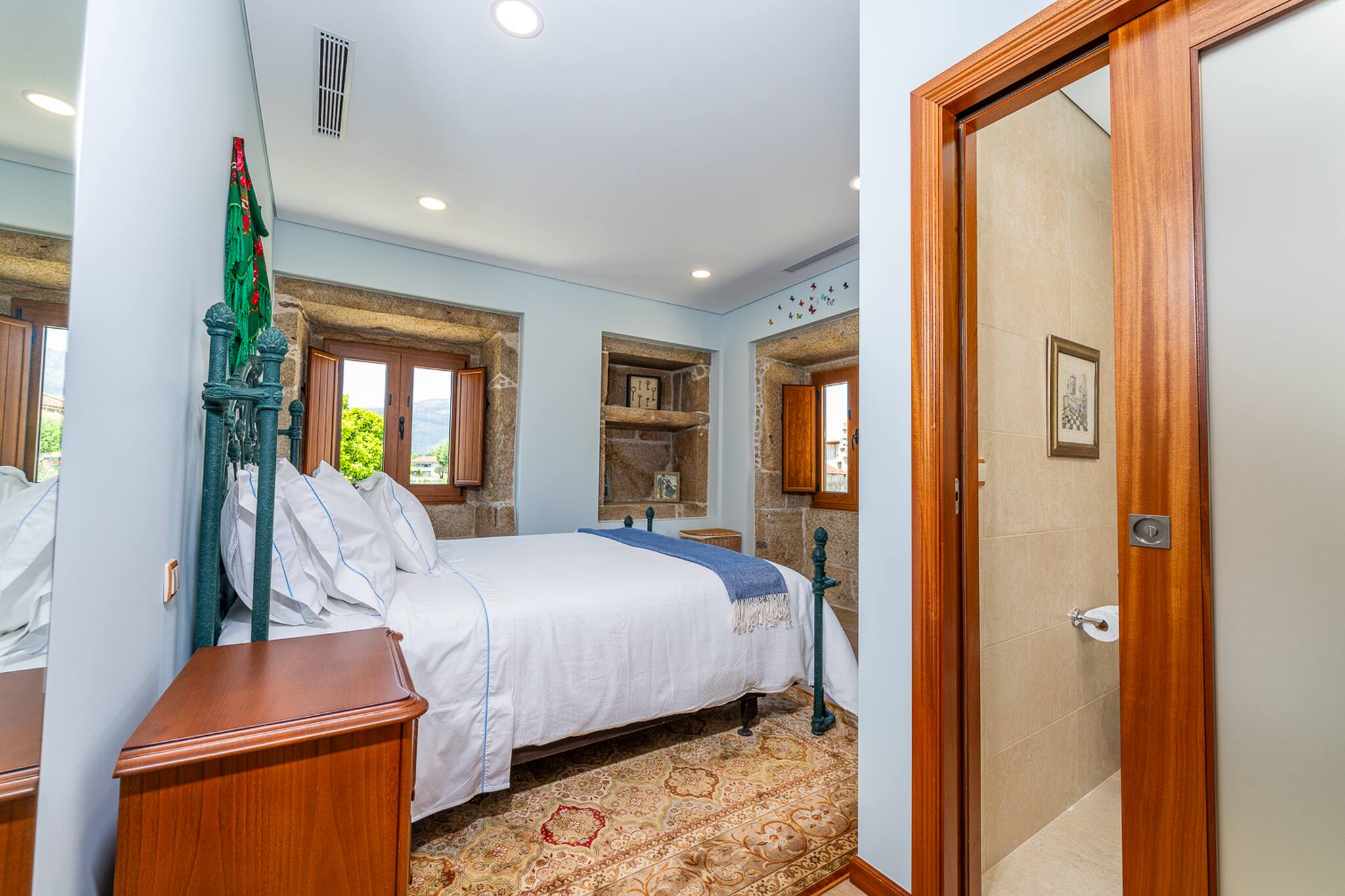Os cinco quartos foram projetados para reproduzir o ambiente calmo de um hotel elegante, com móveis elegantes, casa de banho privativas e um esquemas de cores suaves que exalam estilo, elegância e uma sensação acolhedora de conforto. Nas amplas áreas de estar, peças igualmente elegantes destacam-se num cenário encantador de grandes janelas com vista para uma bela piscina e para a relva e arvoredo que a rodeia.