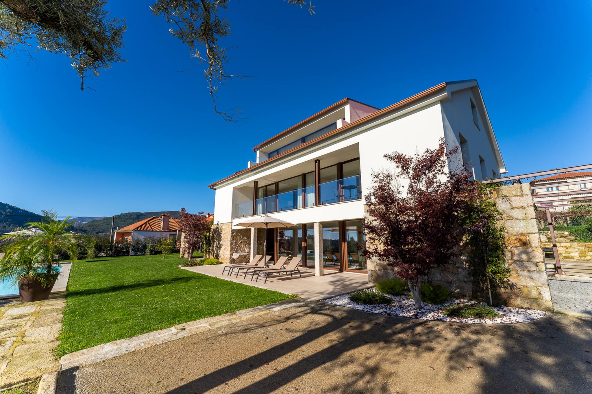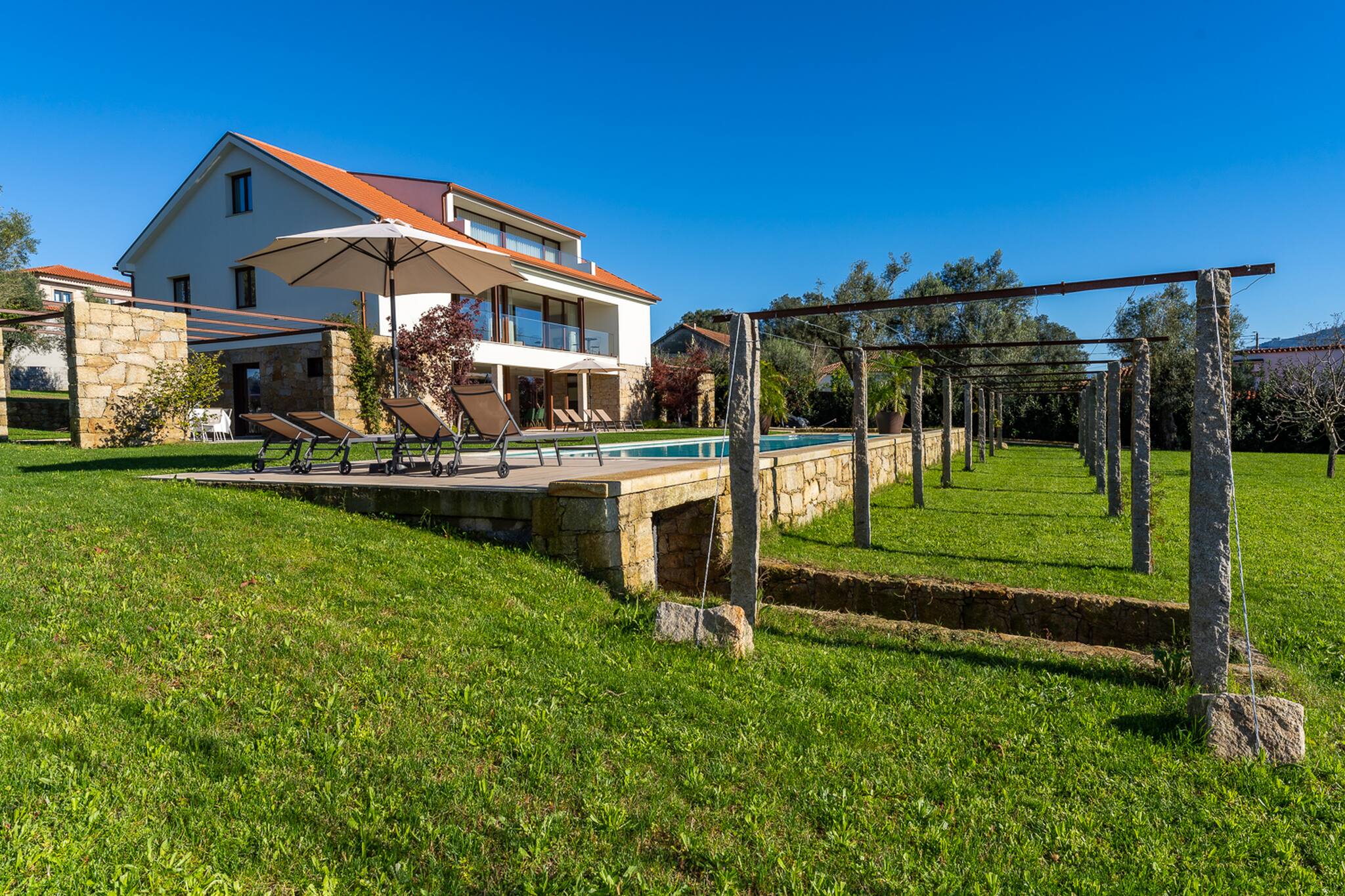 Saia da casa para o terraço coberto que atravessa a fachada principal da casa e ficará envolvido pelo relvado e verá a peça central do jardim bem cuidado: uma atraente piscina cercada de granito e uma tradicional "eira" em granito envelhecido.