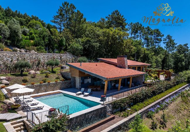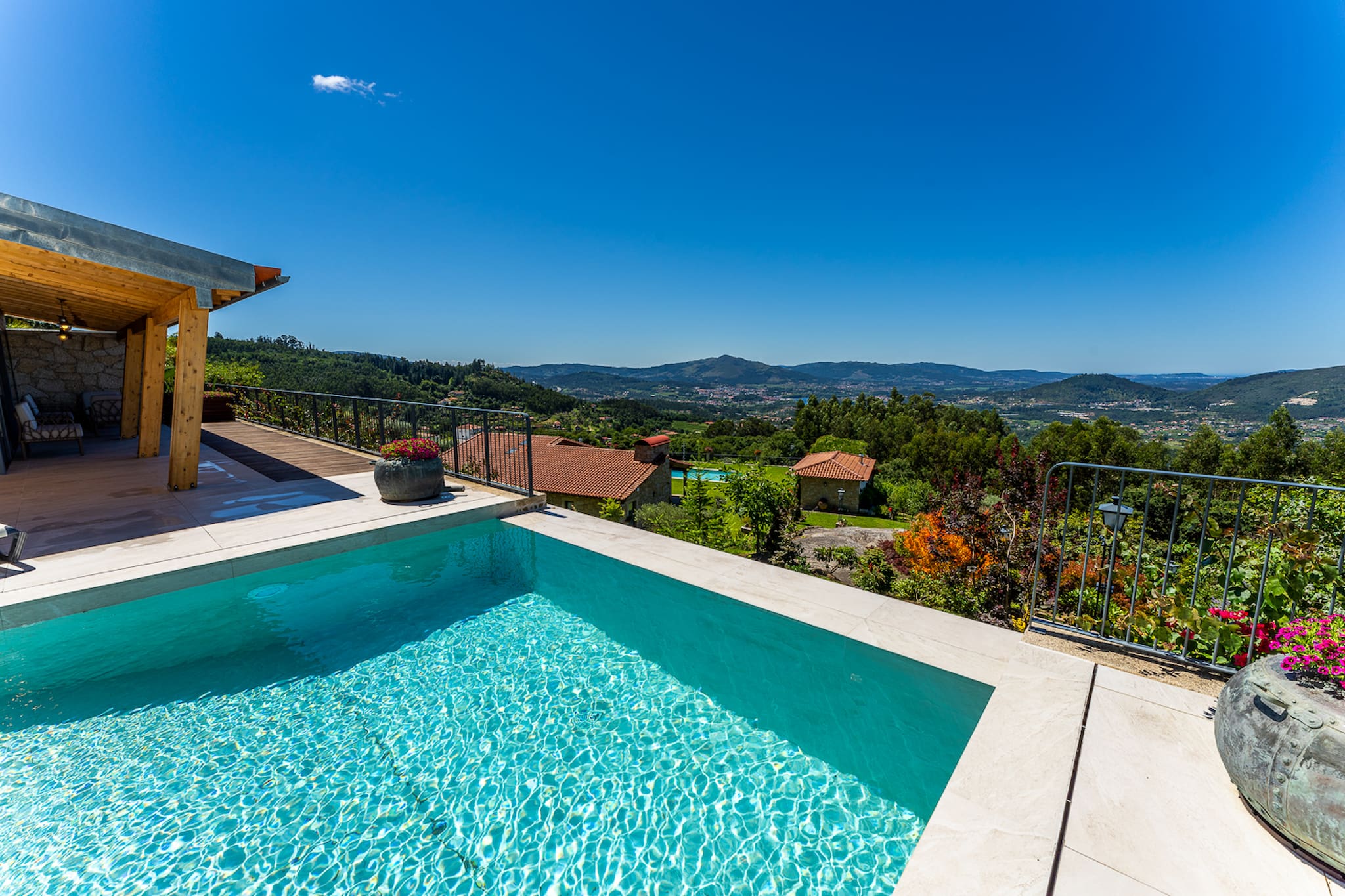 A piscina é um dos locais mais aprazíveis da casa por estar situada numa posição altaneira com vistas para o Vale do Lima onde se pode ver a ponte românica e o rio Lima. Rodeada pela frescura dos jardins e ao som da água da levada, os visitantes podem usar a churrasqueira exterior e realizar as suas refeições debaixo da pérgula de glicínias com vista sobre o vale. -