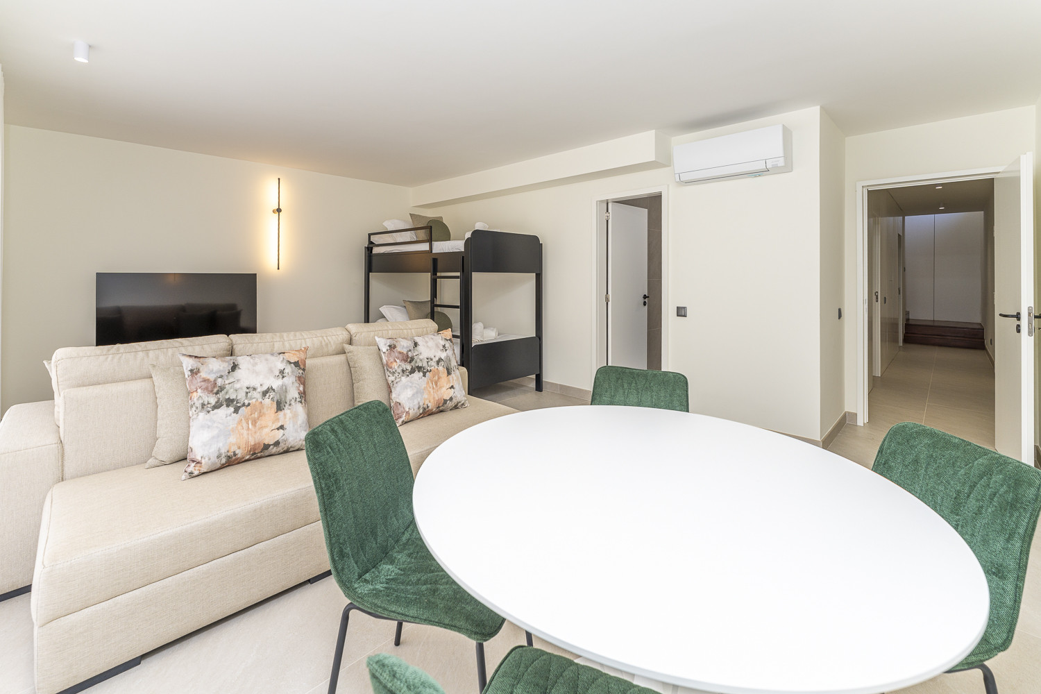 Die Offene Küche mit Induktions-Kochfeld ist ausgestattet in einen Kühlschrank, eine Mikrowelle, ein Backofen, Gefrierschrank und eine Spülmaschine.
