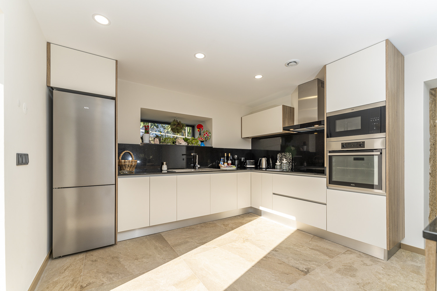 Die Offene Küche mit Ceranfeld ist ausgestattet in einen Kühlschrank, eine Mikrowelle, ein Backofen, Gefrierschrank, eine Spülmaschine, Geschirr/Besteck, Kochutensilien, eine Kaffeemaschine, einen Toaster und einen Wasserkocher.