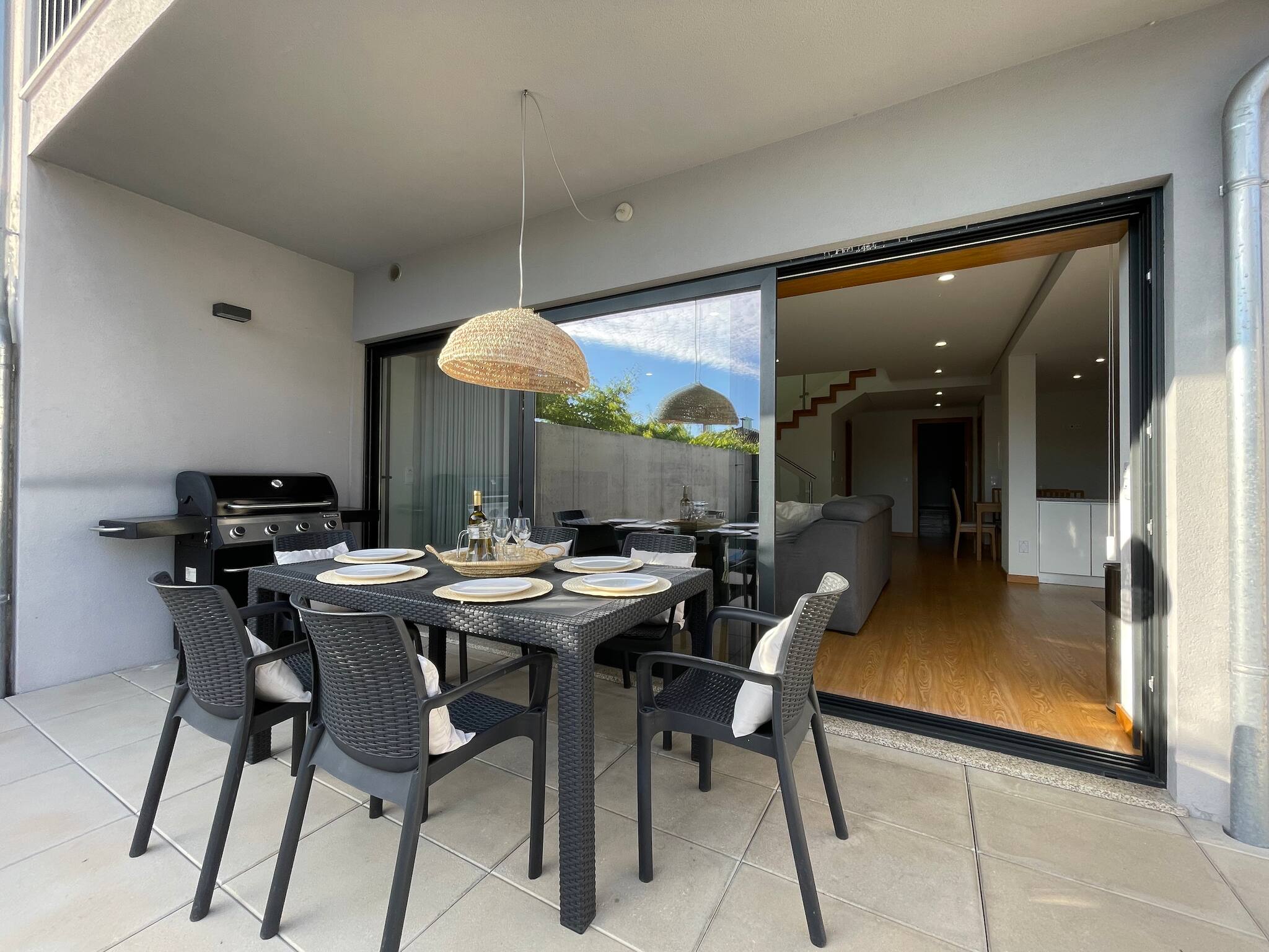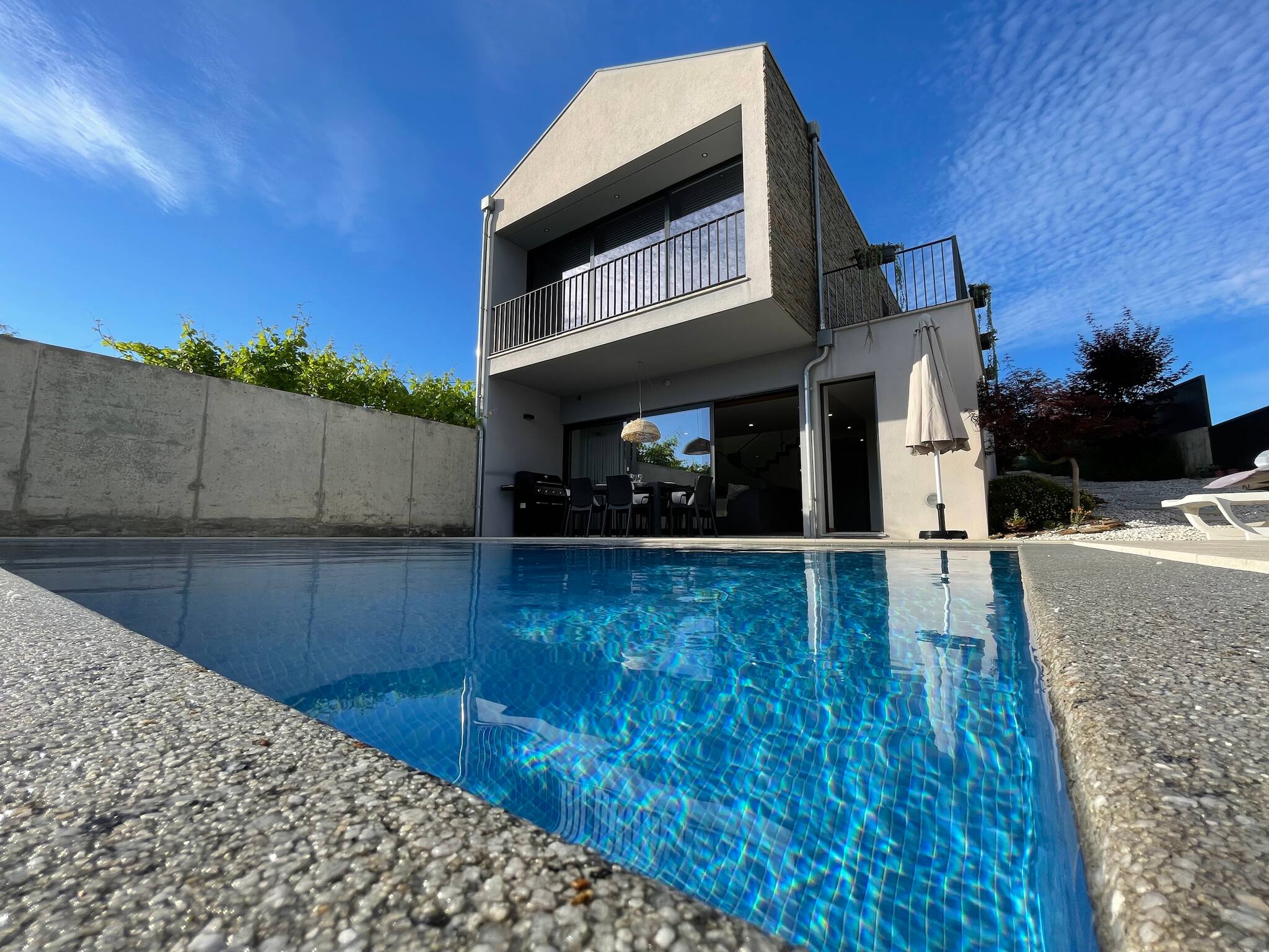 Outside, the house has a small side garden and the pool area with loungers for sunbathing, as well as an outdoor dining table and a fantastic barbecue for your summer meals!