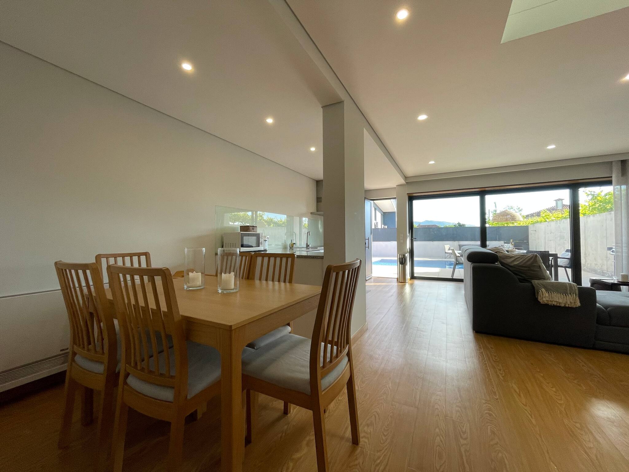- on the ground floor, at pool level, a large living room, kitchen and dining room. In addition to one of the bedrooms (with a double bed) and a bathroom that also serves as a guest toilet. It also has a laundry area.