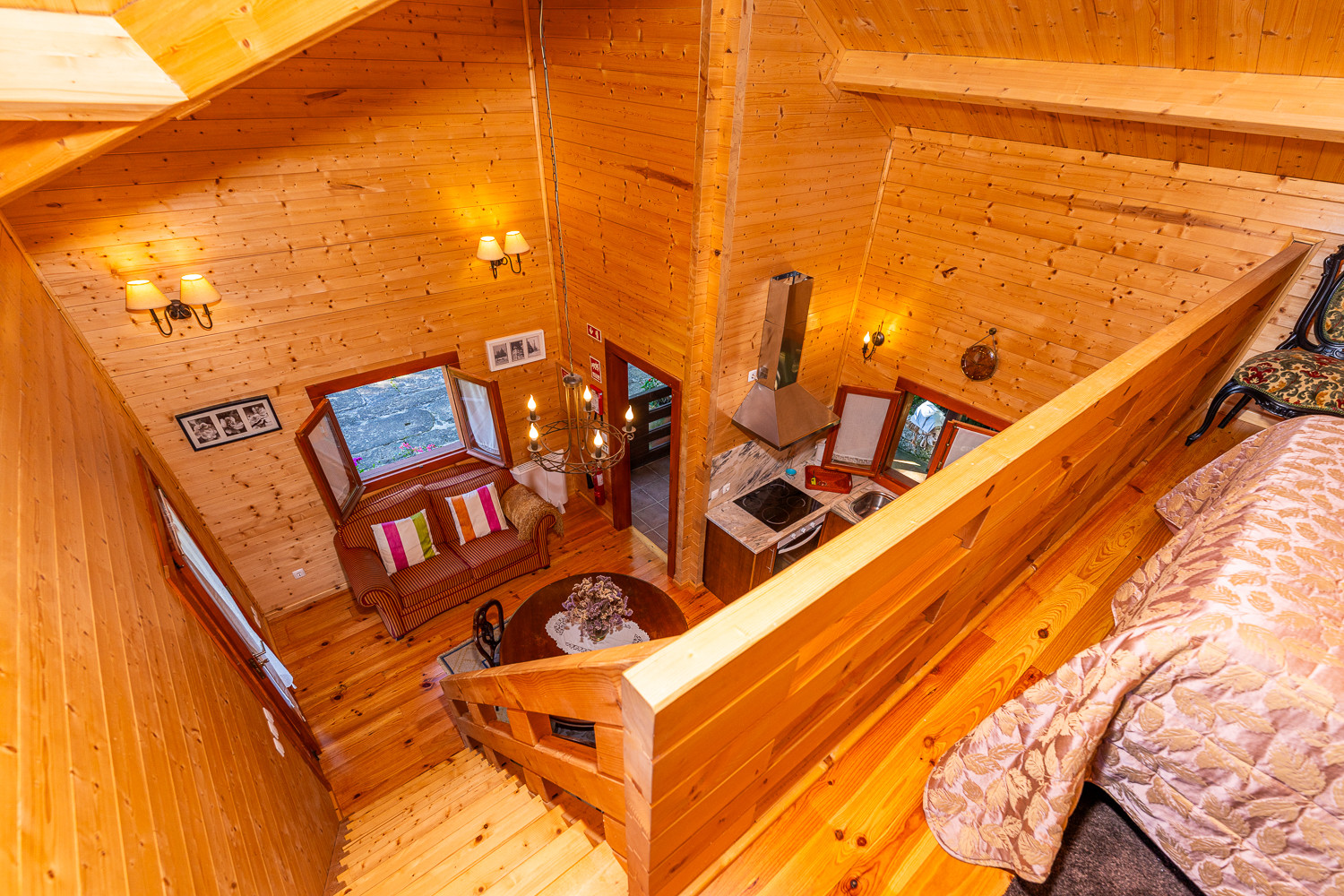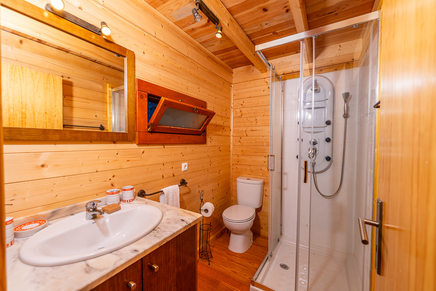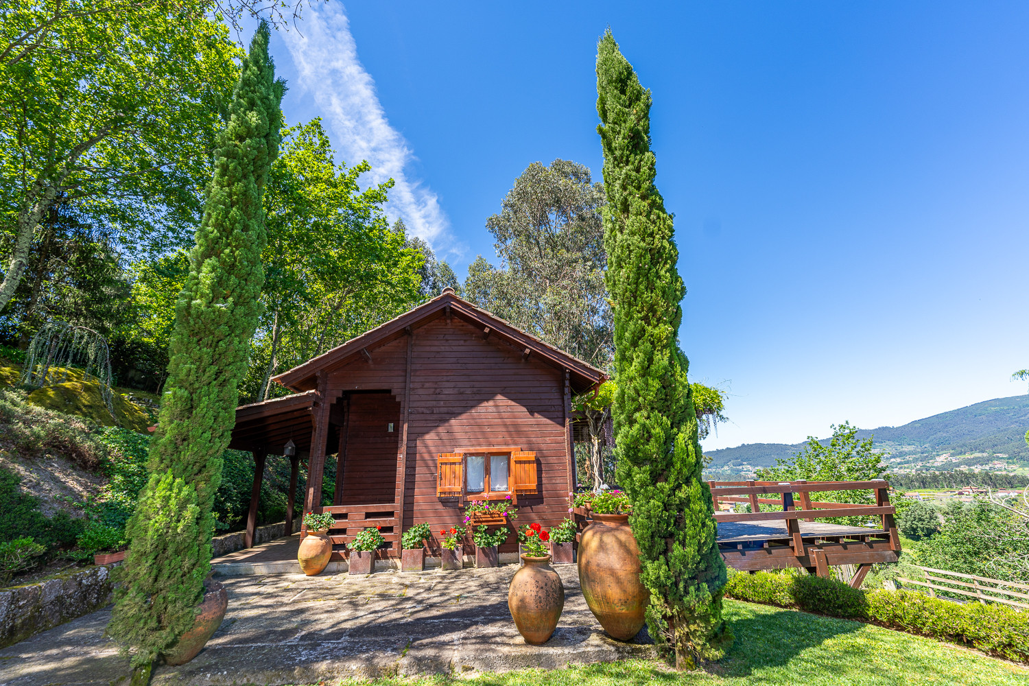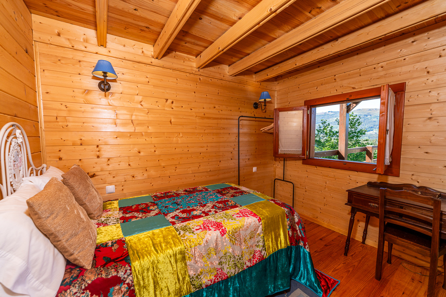 El Bungalow de madera dispone de 2 habitaciones y 1 cuarto de baño, sala de estar y comedor, cocina amueblada y equipada con electrodomésticos, vajilla y utensilios y de amplia terraza orientada hacia los jardines.