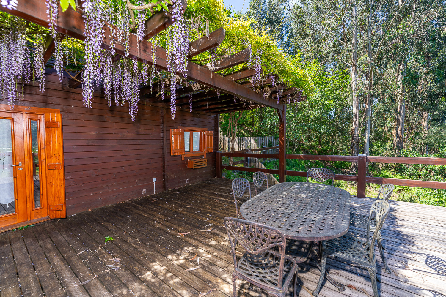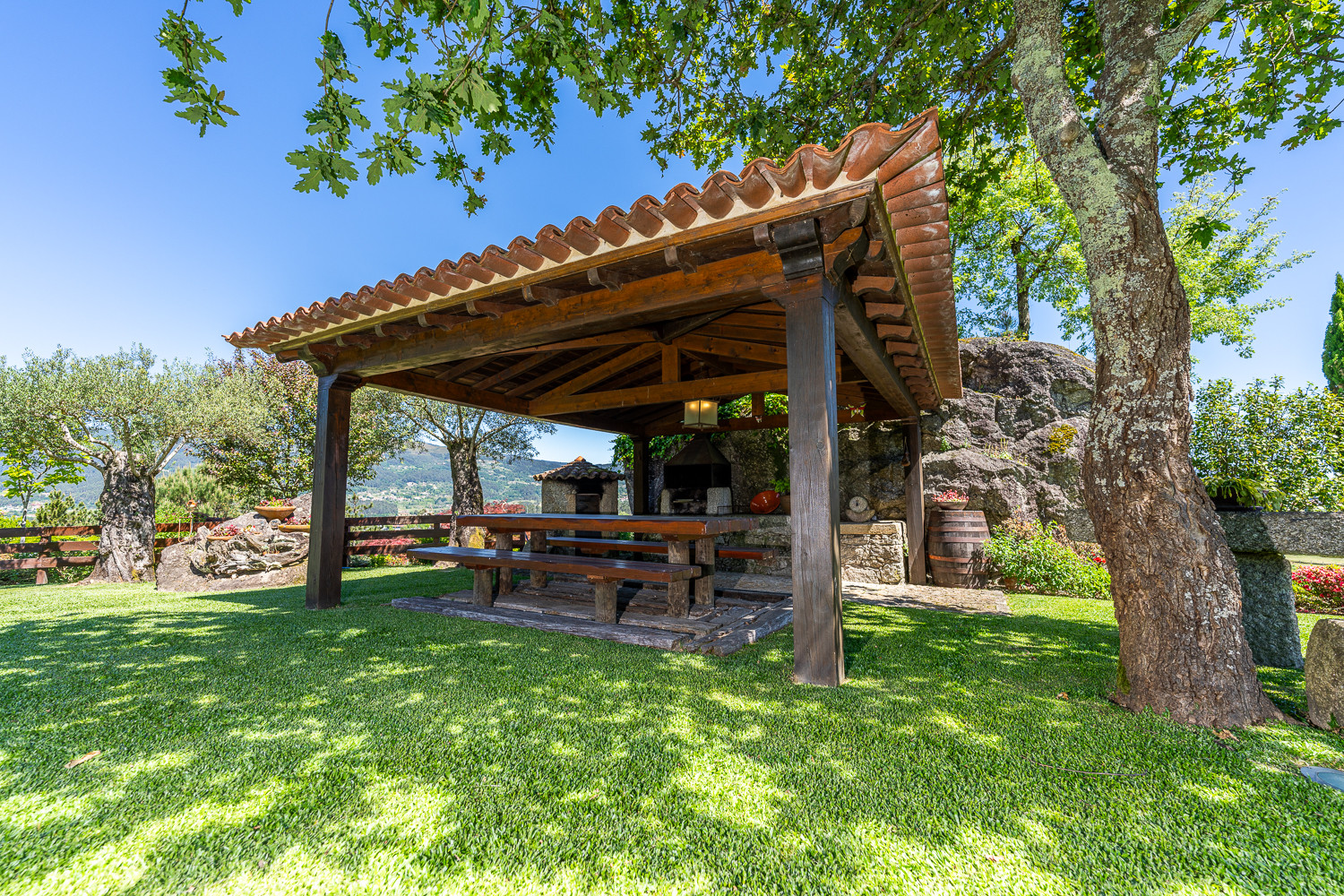 La piscina es uno de los lugares más agradables de la casa por estar rodeada por la frescura de los árboles frutales y ornamentales y por la proximidad con el bosque cuidado. También junto a la piscina tenemos la terraza donde se encuentra la barbacoa y horno tradicional.