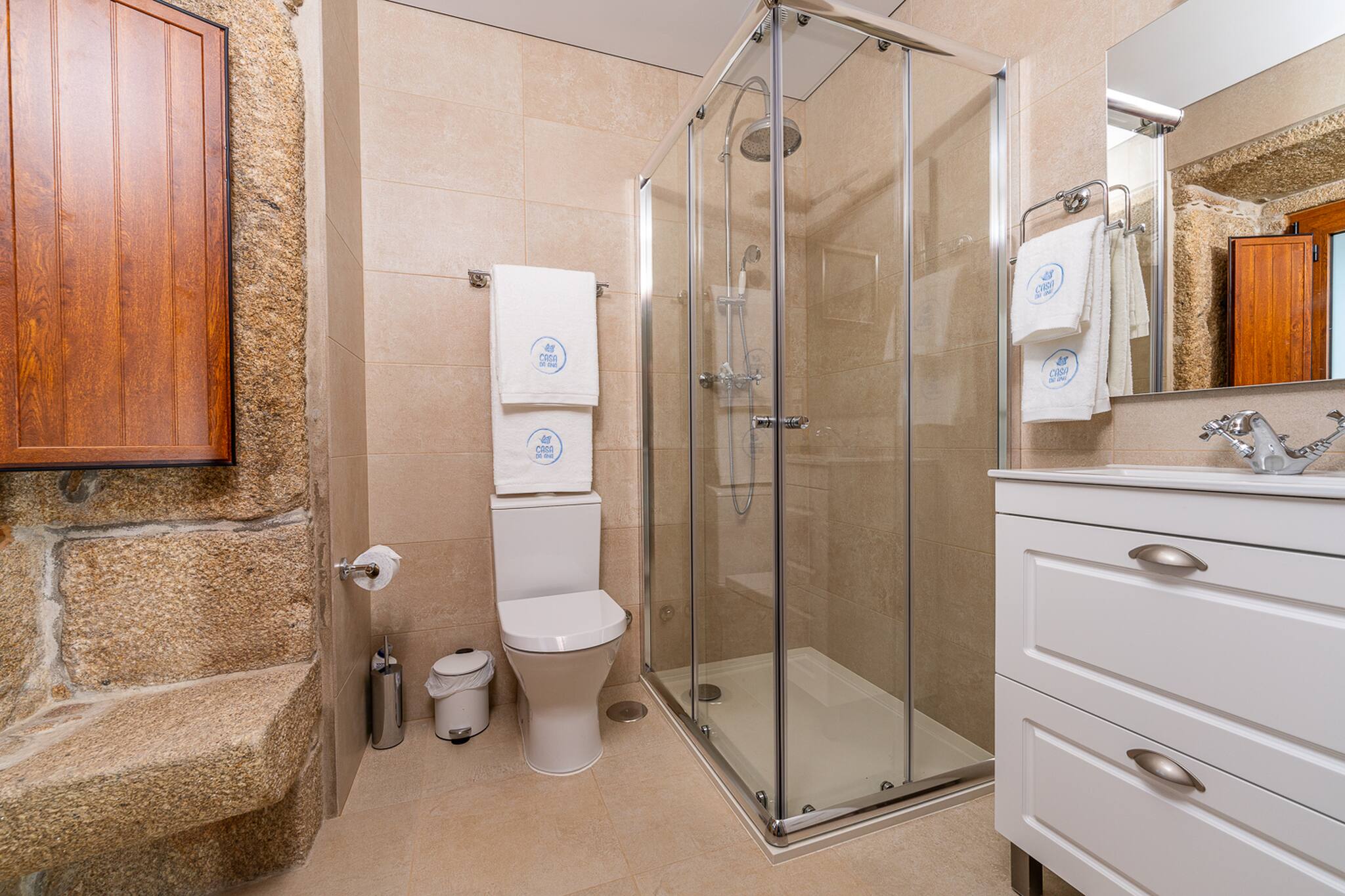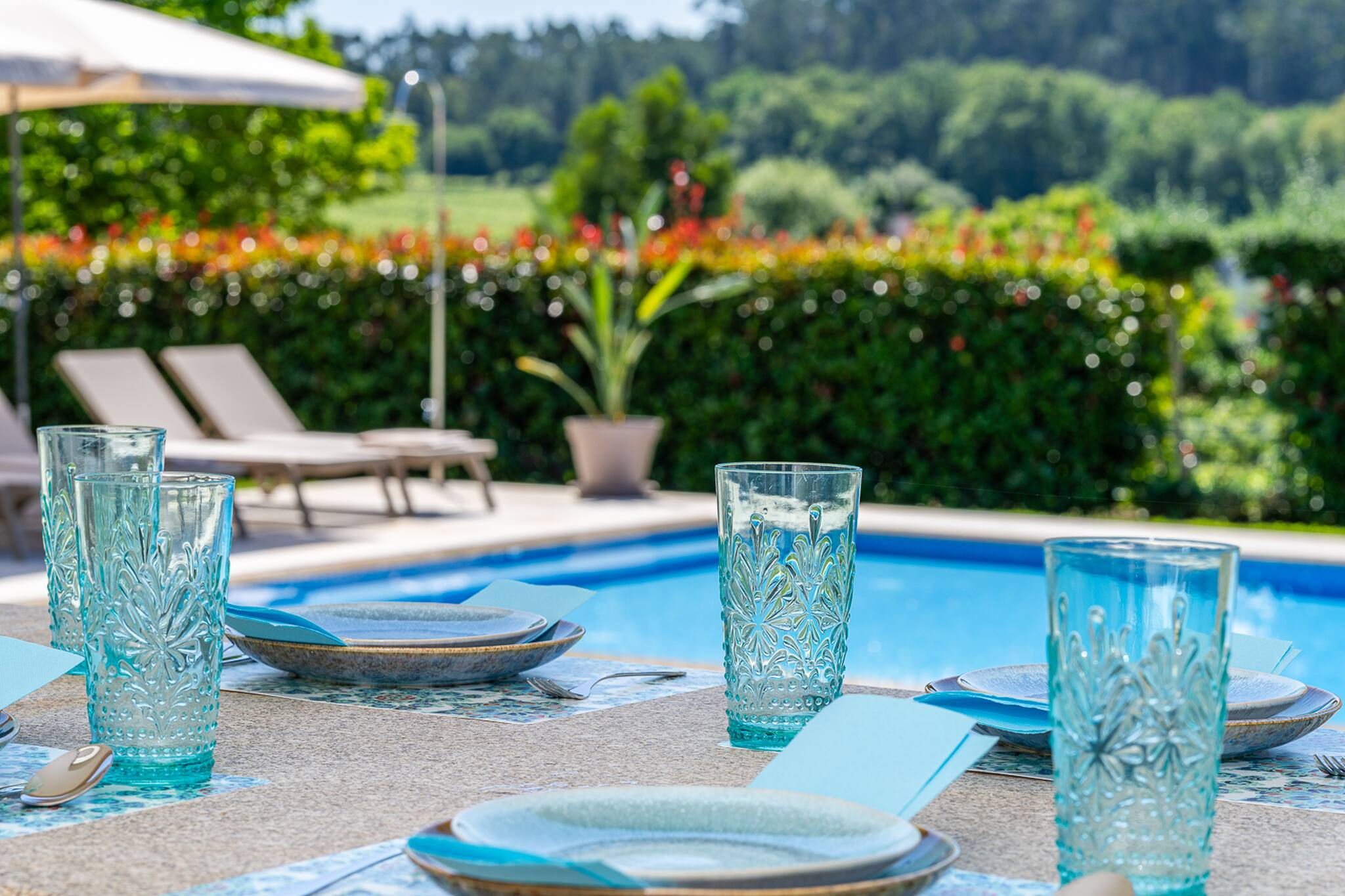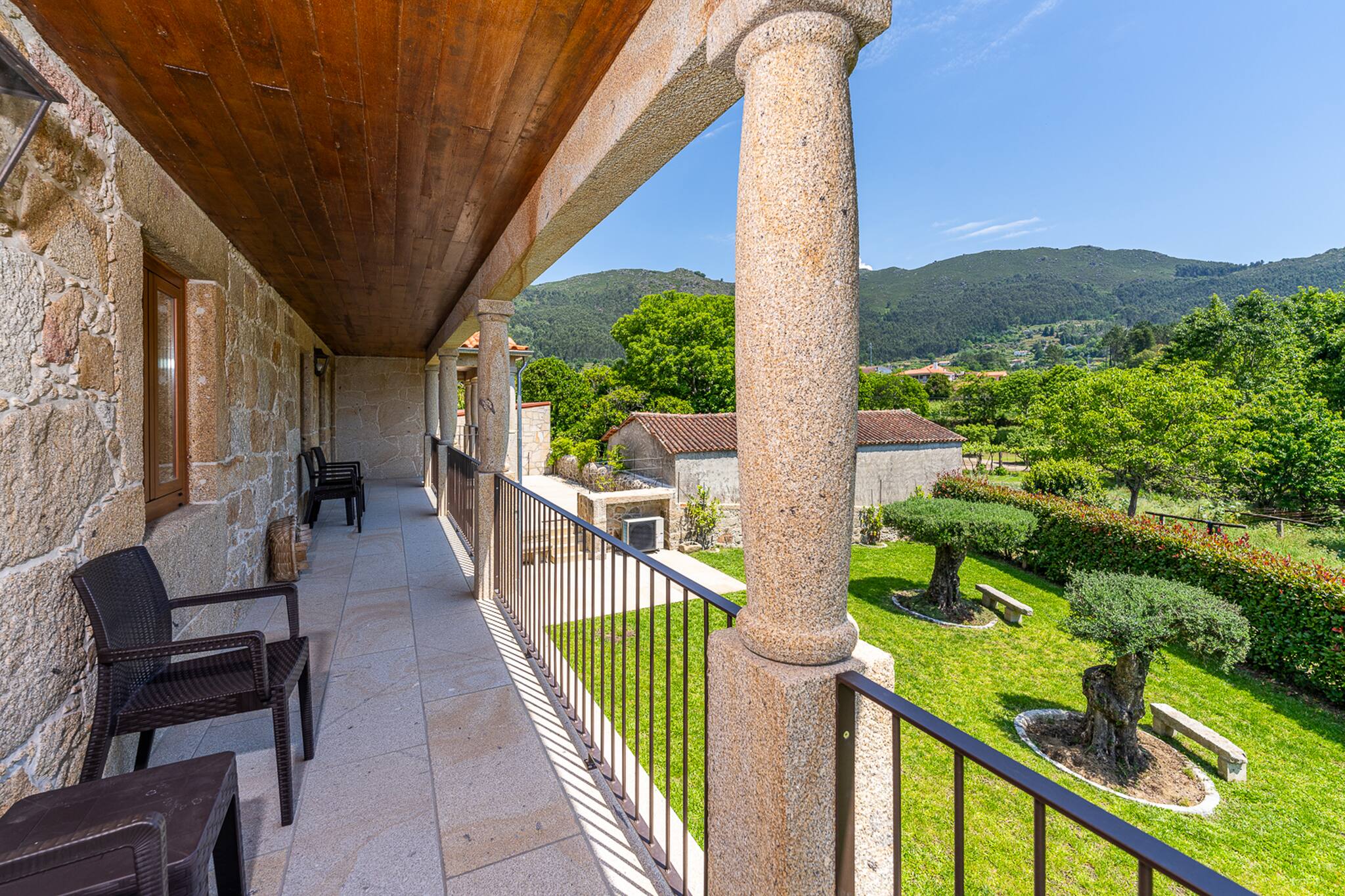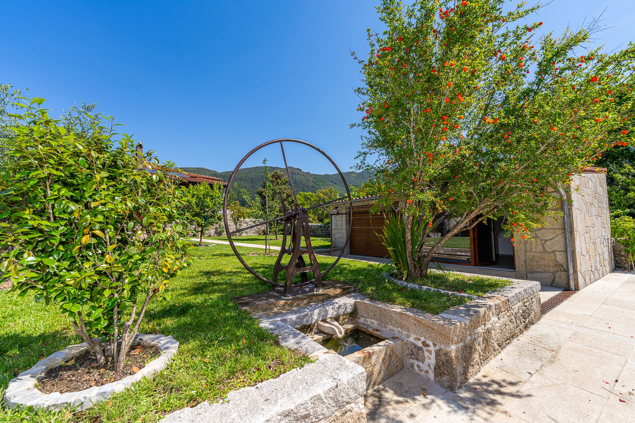 Salga de la casa hacia la terraza cubierta que atraviesa la fachada principal de la casa y quedará envuelto por el césped y verá la pieza central del jardín bien cuidado: una atractiva piscina rodeada de granito y una tradicional "eira" en granito envejecido.