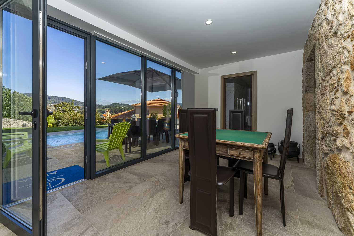La piscina es uno de los lugares más agradables de la casa por estar situada en una posición elevada con vistas al Valle del Lima donde se puede ver el puente románico y el río Lima. Rodeada por la frescura de los jardines y al son del agua de la levada, los visitantes pueden usar la barbacoa exterior y realizar sus comidas bajo la pérgola de glicinas con vista sobre el valle.
