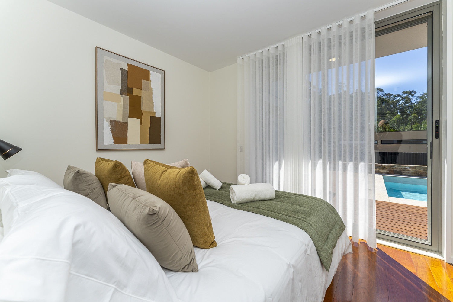 Las cinco habitaciones fueron diseñadas para reproducir el ambiente tranquilo de un hotel elegante, con muebles elegantes, baños privados y esquemas de colores suaves que exhalan estilo, elegancia y una sensación acogedora de confort. En las amplias áreas de estar, piezas igualmente elegantes se destacan en un escenario encantador de grandes ventanales con vista a una hermosa piscina y al césped y arbolado que la rodean.