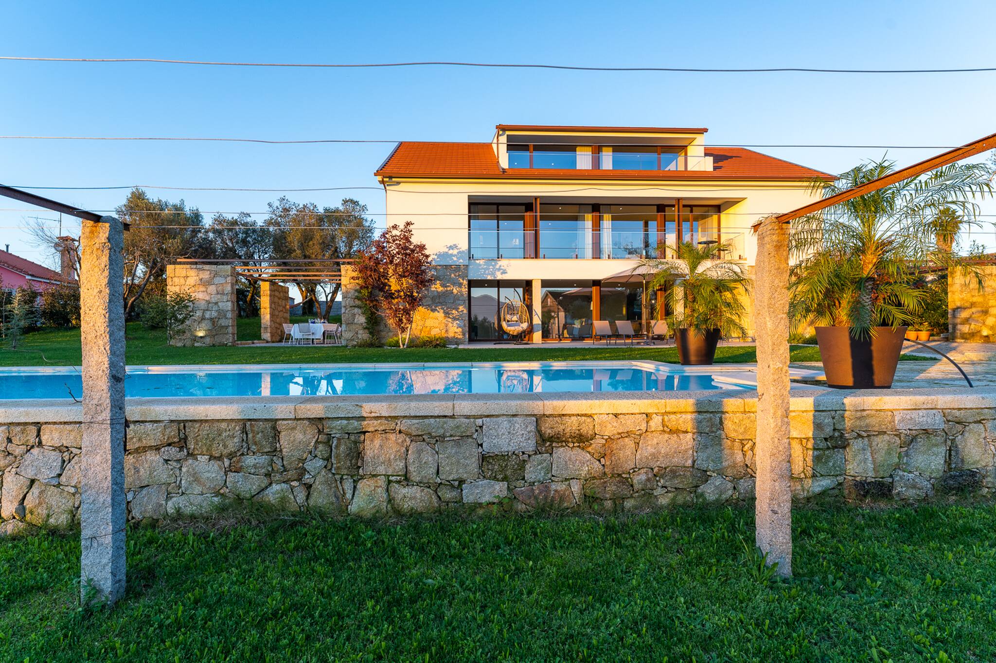 Salga de la casa hacia la terraza cubierta que atraviesa la fachada principal de la casa y quedará envuelto por el césped y verá la pieza central del jardín bien cuidado: una atractiva piscina rodeada de granito y una tradicional "eira" en granito envejecido.