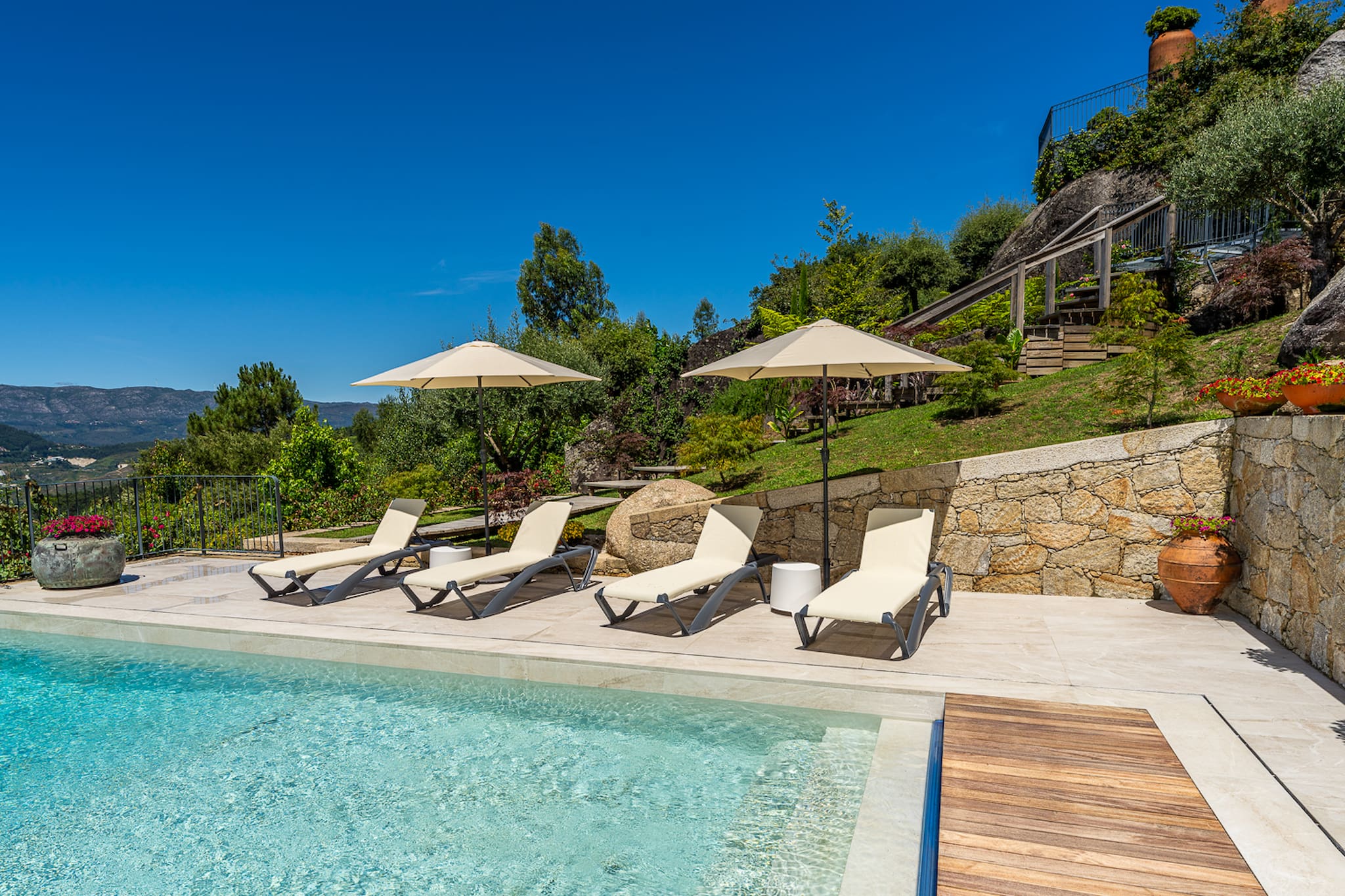 La piscina es uno de los lugares más agradables de la casa por estar situada en una posición elevada con vistas al Valle del Lima donde se puede ver el puente románico y el río Lima. Rodeada por la frescura de los jardines y al son del agua de la levada, los visitantes pueden usar la barbacoa exterior y realizar sus comidas bajo la pérgola de glicinas con vista sobre el valle. -