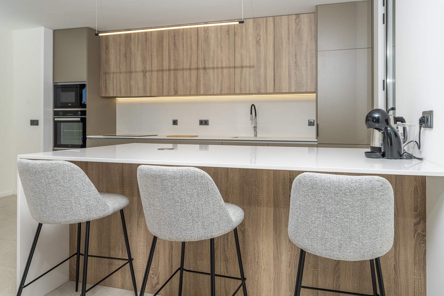 La cocina americana, de inducción, está equipada con nevera, microondas, horno, congelador y lavavajillas.