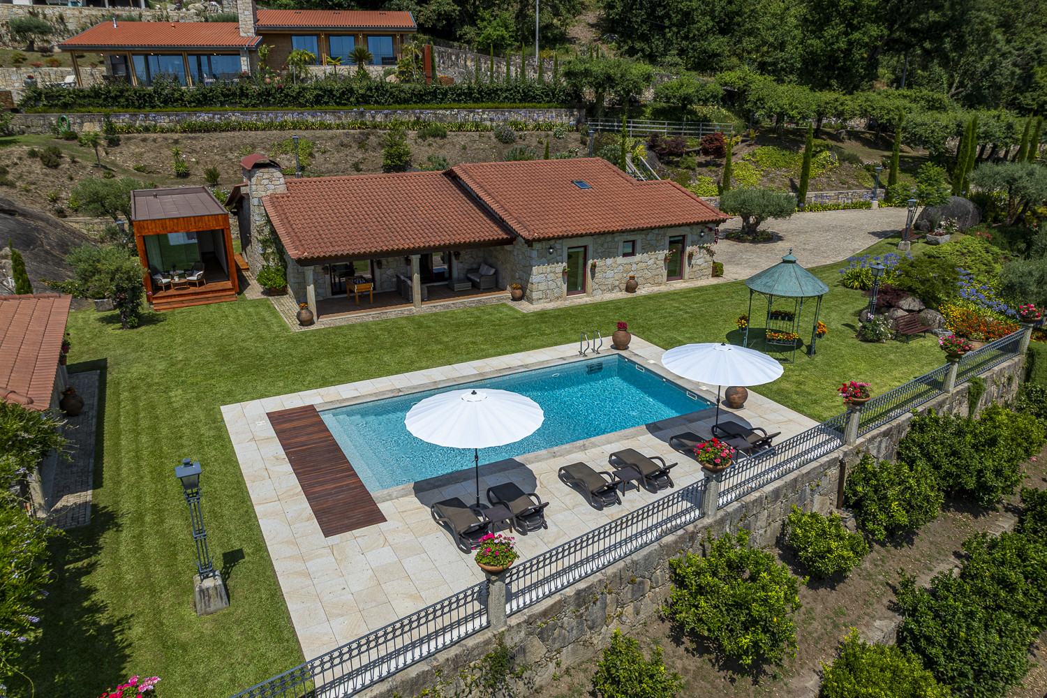 La piscine est l'un des endroits les plus agréables de la maison car située dans une position dominante avec vue sur la Vallée du Lima où l'on peut voir le pont roman et la rivière Lima. Entourée par la fraîcheur des jardins et au son de l'eau du canal, les visiteurs peuvent utiliser le barbecue extérieur et prendre leurs repas sous la pergola de glycines avec vue sur la vallée.