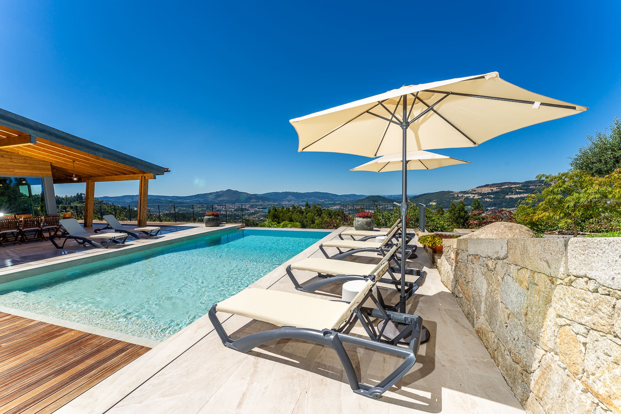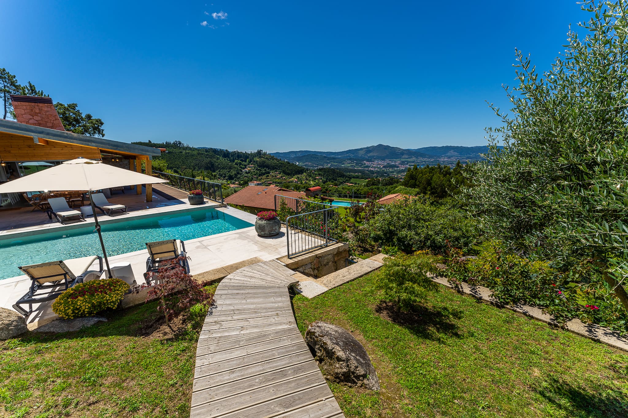 La piscine est l'un des endroits les plus agréables de la maison car située dans une position dominante avec vue sur la Vallée du Lima où l'on peut voir le pont roman et la rivière Lima. Entourée par la fraîcheur des jardins et au son de l'eau du canal, les visiteurs peuvent utiliser le barbecue extérieur et prendre leurs repas sous la pergola de glycines avec vue sur la vallée. -
