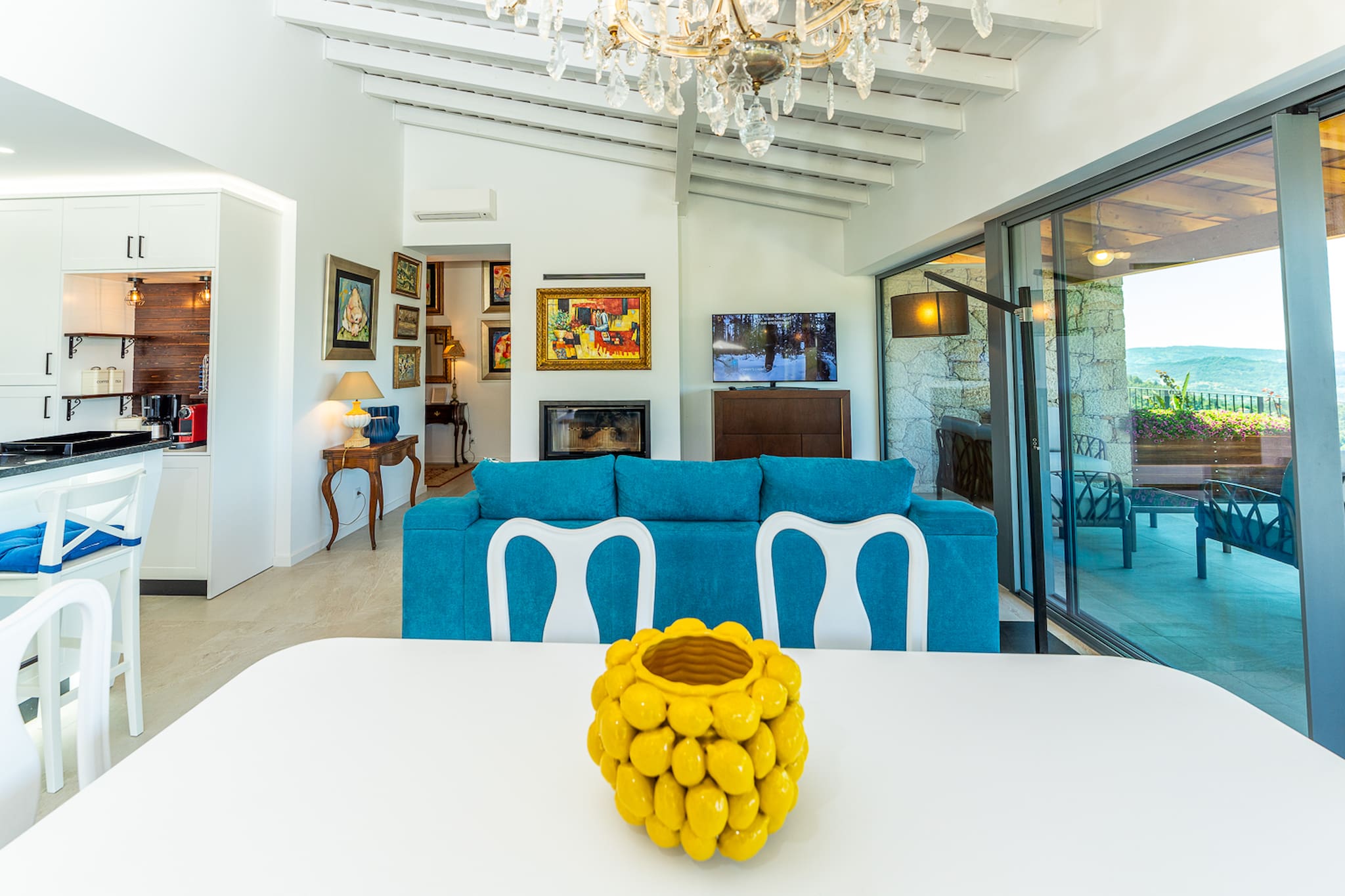 Intérieur : Des espaces vastes baignés de lumière naturelle, avec une décoration minimaliste et chaleureuse. Le salon invite à de longues conversations, tandis que la cuisine entièrement équipée est prête pour vos festins en famille.