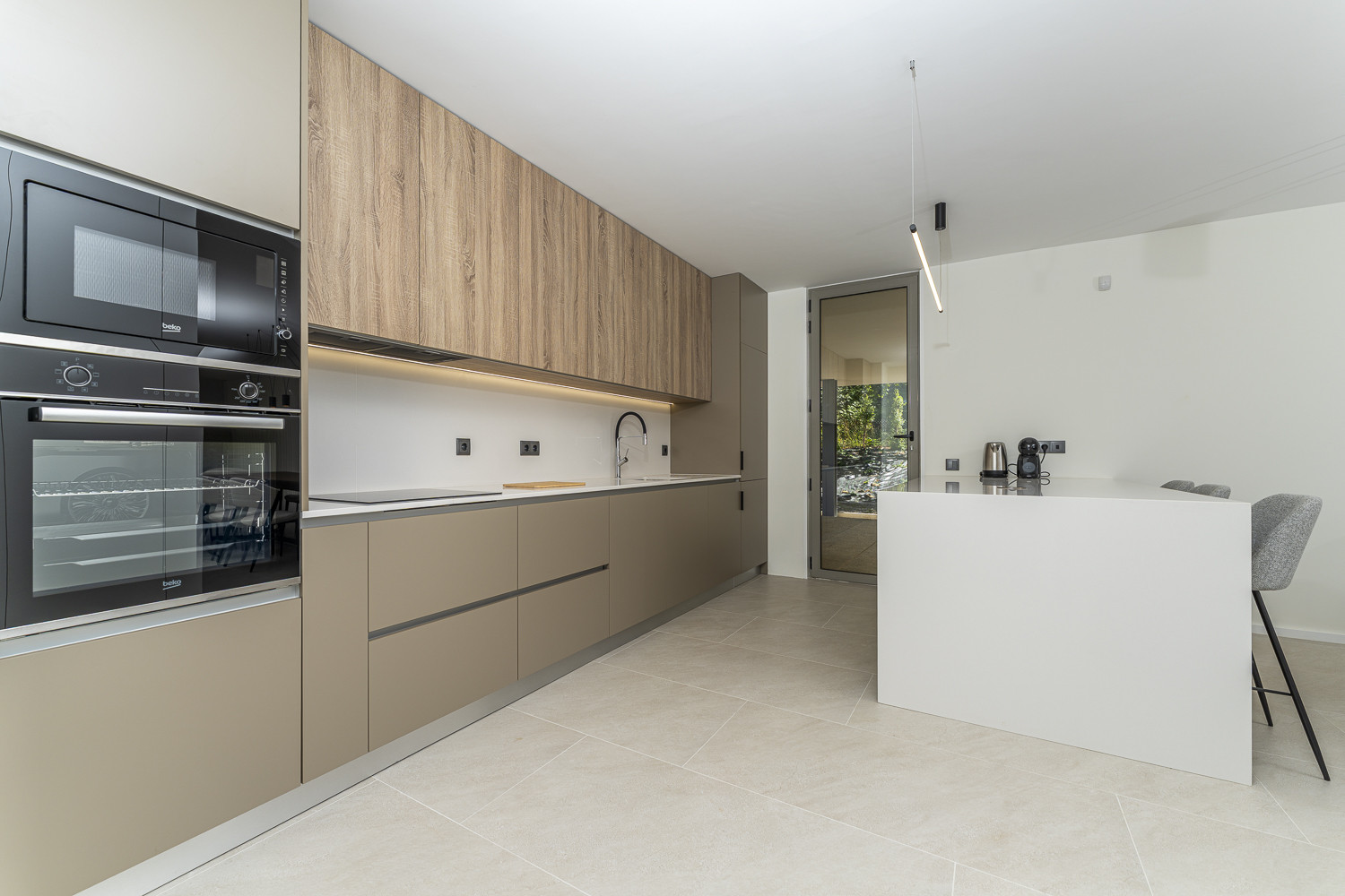 A kitchenette, de inducção, está equipada com frigorífico, microondas, forno, congelador e máquina de lavar louça.